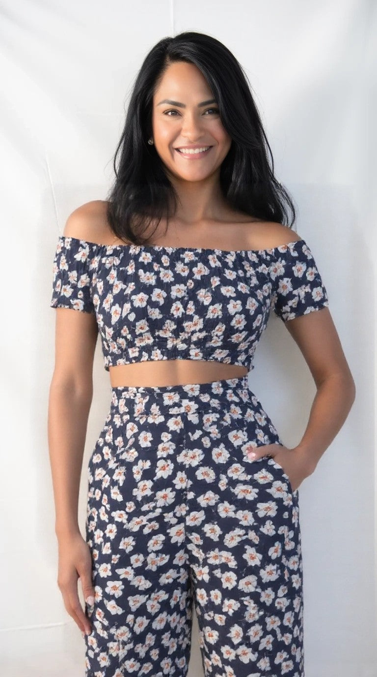 Bring some beautiful blooms into your life when you add the Lulus Flirty Flowers Navy Floral Print Smocked Two-Piece Jumpsuit to your wardrobe! Bold floral print decorates lightweight woven fabric as it shapes this summery two-piece set. Crop top has a smocked construction and features an off-the-shoulder neckline, while the matching wide-leg pants have a high, elasticized waist and side seam pockets, and fall to ankle-length hems.