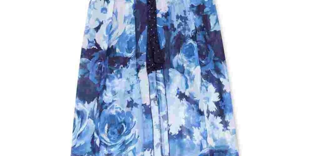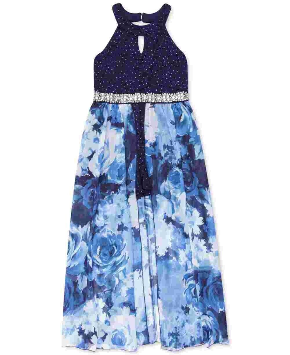 Shell love to show off the walk-through style of this pretty maxi dress from Speechless, fashioned with sparkly lace. Maxi silhouette Round neckline; back zipper closure Glitter lace bodice; embellishments at waist; floral-print walk-through skirt Shell: polyester/spandex; lining: polyester Hand wash Imported