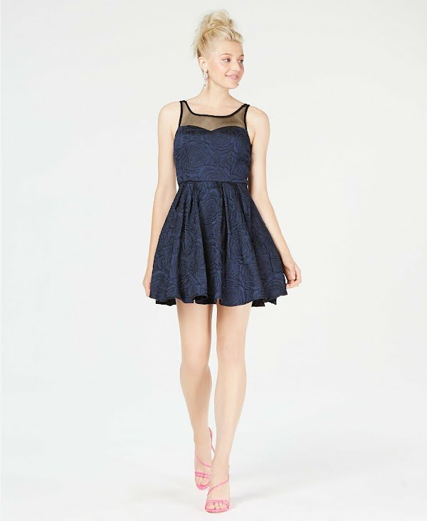 The party starts with Trixxis fit-and-flare dress, beautifully finished in illusion mesh and a rose texture. Approx. model height is 510 and she is wearing a size 7 Illusion scoop neckline, sweetheart at bust; Fit and flare silhouette Hidden back zipper Allover rose texture; illusion mesh at front and back yoke; pleated skirt Shell, lining and mesh: polyester Hand wash Imported