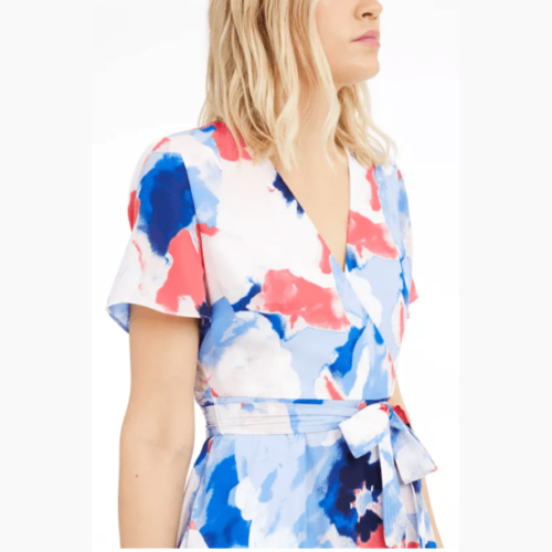 A print adds a vibrant twist to Alfanis asymmetrical wrap dress. V-neckline; Asymmetrical wrap silhouette Pull-on styling Unlined Polyester Machine washable Imported