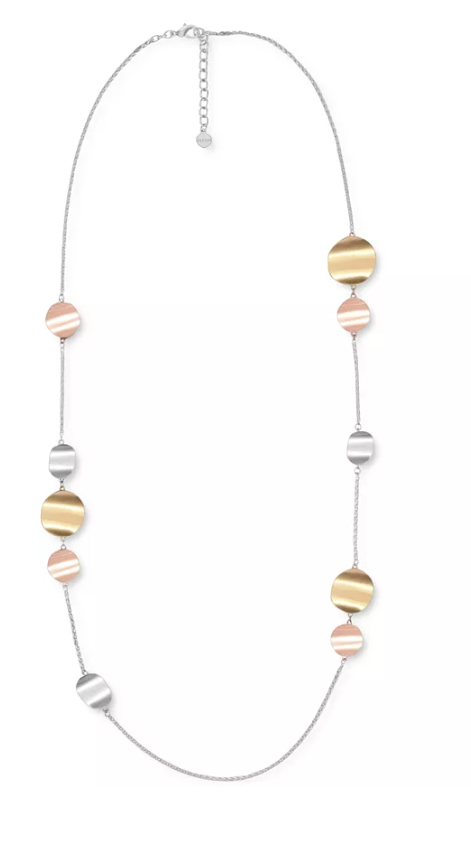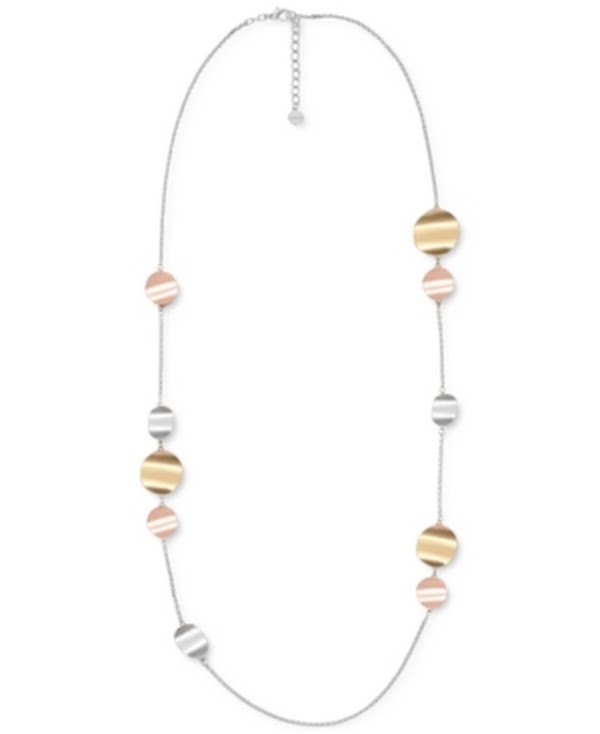 Rippled disks lend a modern look to this long Alfani station necklace, sure to elevate the appeal of any outfit. Rippled disks lend a modern look to this long Alfani station necklace, sure to elevate the appeal of any outfit. Set in silver-tone, gold-tone and rose gold-tone mixed metal Approx. length: 40 + 2 extender Lobster clasp closure