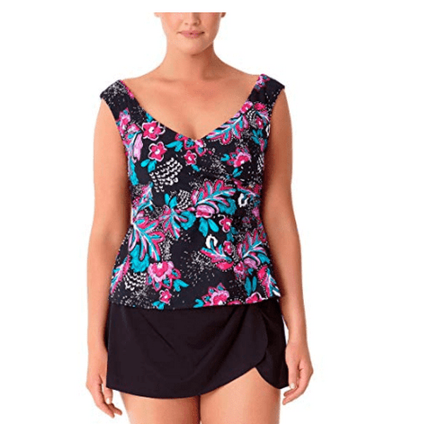 Item Notes: Shell: 82% Nylon / 18% Spandex -- Lining: 90% Nylon / 10% Spandex Imported Floral Printed Design Pattern / Draped Twist Front / Thats a Wrap Collection Removable Padded Cups / Stretch Fit Elastic Shoulder Straps Tankini Top Bathing Suit Swimwear Separates / Womens Plus Sizes Great for Tropical Vacations, Spring Break, Summer, Beach & Pool! Designer Brand Name Fashion Summer Clothing & Beach Apparel for Women.