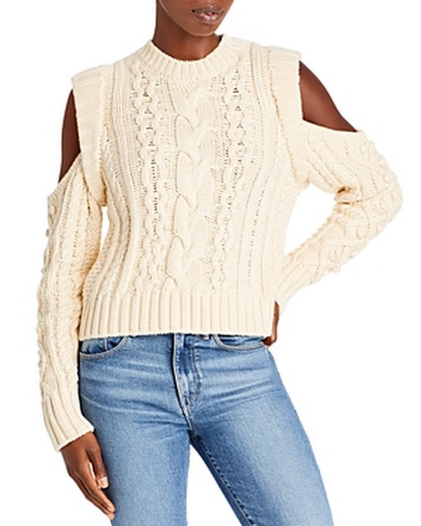 Fits true to size, order your normal size Model measurements: 510 height, 33.5 bust, 23.5 waist, 34.5 hips, wearing a size small PRODUCT DETAILS Ribbed crewneck Shoulder cutouts Long sleeves, ribbed cuffs Allover cable knit Ribbed hem This item is part of our 100% Bloomingdales collection, featuring exclusive pieces you wont find anywhere else. Imported MATERIAL & CARE 60% cotton/30% nylon/10% wool Hand wash or dry clean
