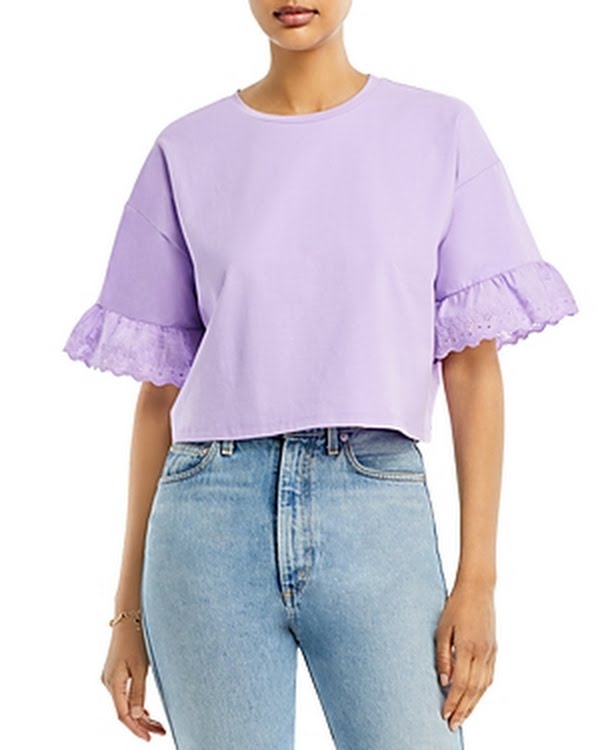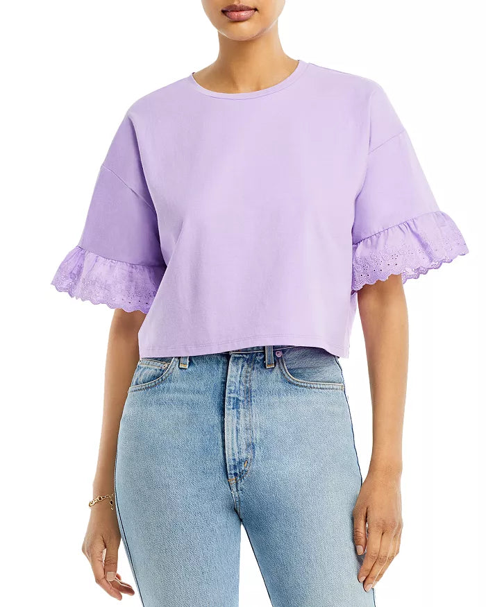 You won’t find AQUA’s of-the-moment details and fun, feminine designs anywhere else. Exclusive to Bloomingdale’s, the trend-right collections have your entire closet covered, from formal dresses to off-duty athleisure and activewear to sumptuous cashmere in every color under the sun—with statement-making accessories to complete every look. Limited-edition collaborations with your favorite labels and influencers drop seasonally, while new AQUA Pet and mommy-and-me collections let you twin with your little ones (human or otherwise!) in style. FEATURES Crewneck Short sleeves with dropped shoulders and ruffled eyelet trim at cuffs Cropped silhouette Pullover style This item is part of our 100% Bloomingdales collection, featuring exclusive pieces you wont find anywhere else. Imported SIZE & FIT Fits true to size, order your normal size Designed for a relaxed fit Model measurements: 510 height, 33.5 bust, 23.5 waist, 34.5 hips, wearing a size small MATERIAL & CARE 95% cotton/5% spandex Hand wash