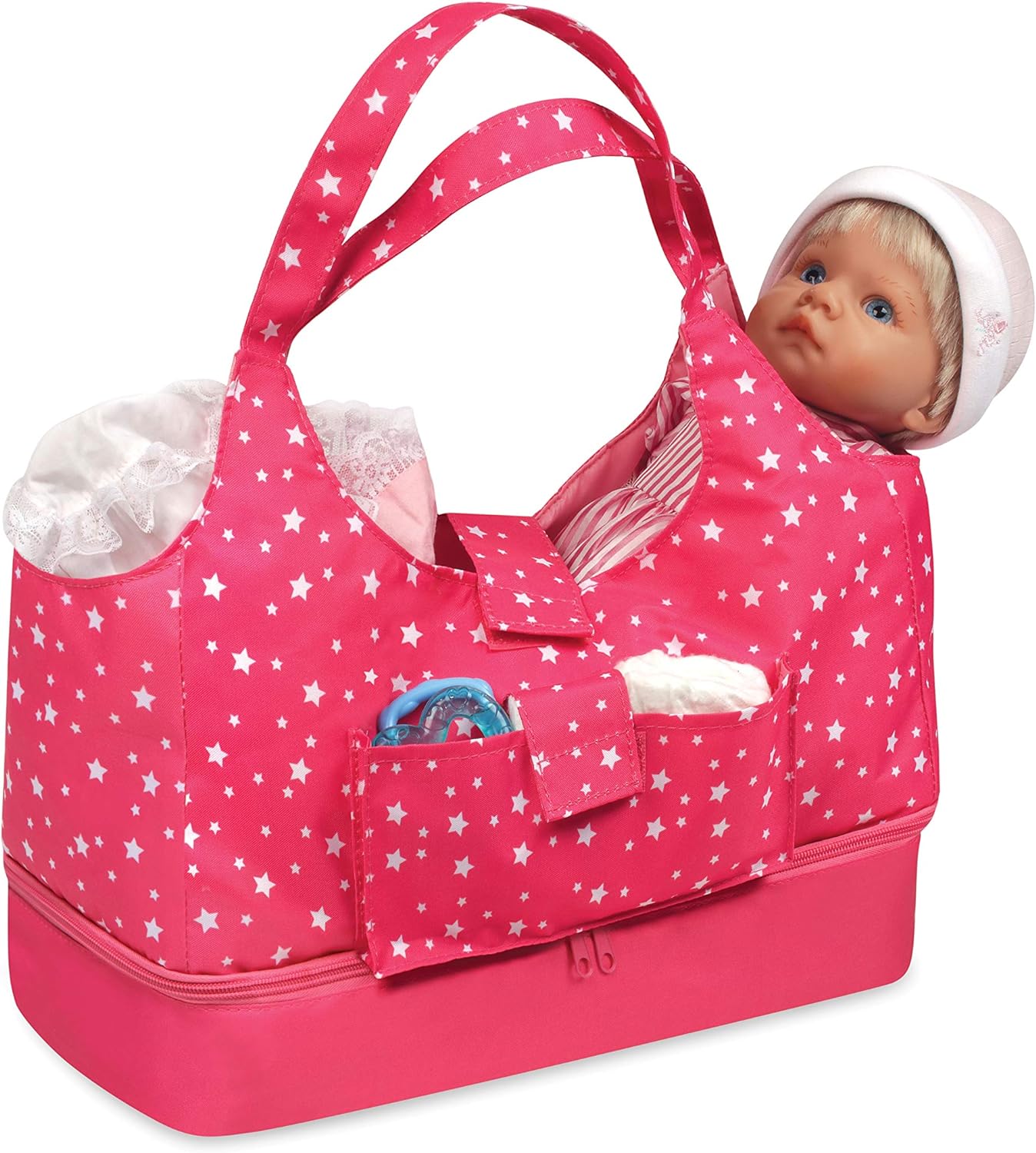 This item is a toy and is not intended for use with real babies. TAKE YOUR DOLLS ON-THE-GO: Doll carrier holds up to two 18 inch dolls, or one 20 inch doll, with plenty of extra room for accessories TONS OF STORAGE: The separate zippered compartment features one large organizer and two smaller pockets to store doll clothes, shoes, toys, and other accessories STYLISH TRAVEL TOTE: Adorable pink star design is perfect for all doll brands! Storage bag measures 17 L x 7 W x 16.5 H Bottom storage compartment: 16 L x 7 XW 2.75 H A BRAND YOU CAN TRUST: Badger Basket is a family owned and U.S. based company with a long-standing history of creating quality doll toys, nursery essentials and storage furniture for you and your family