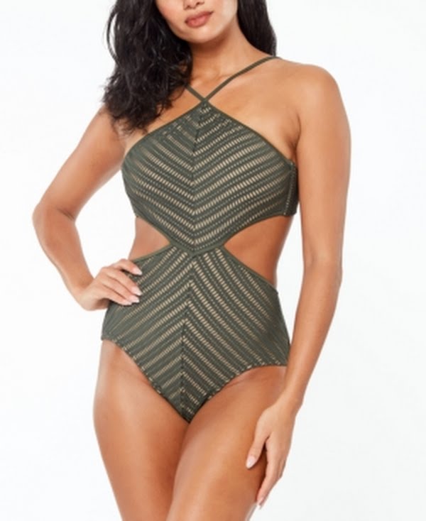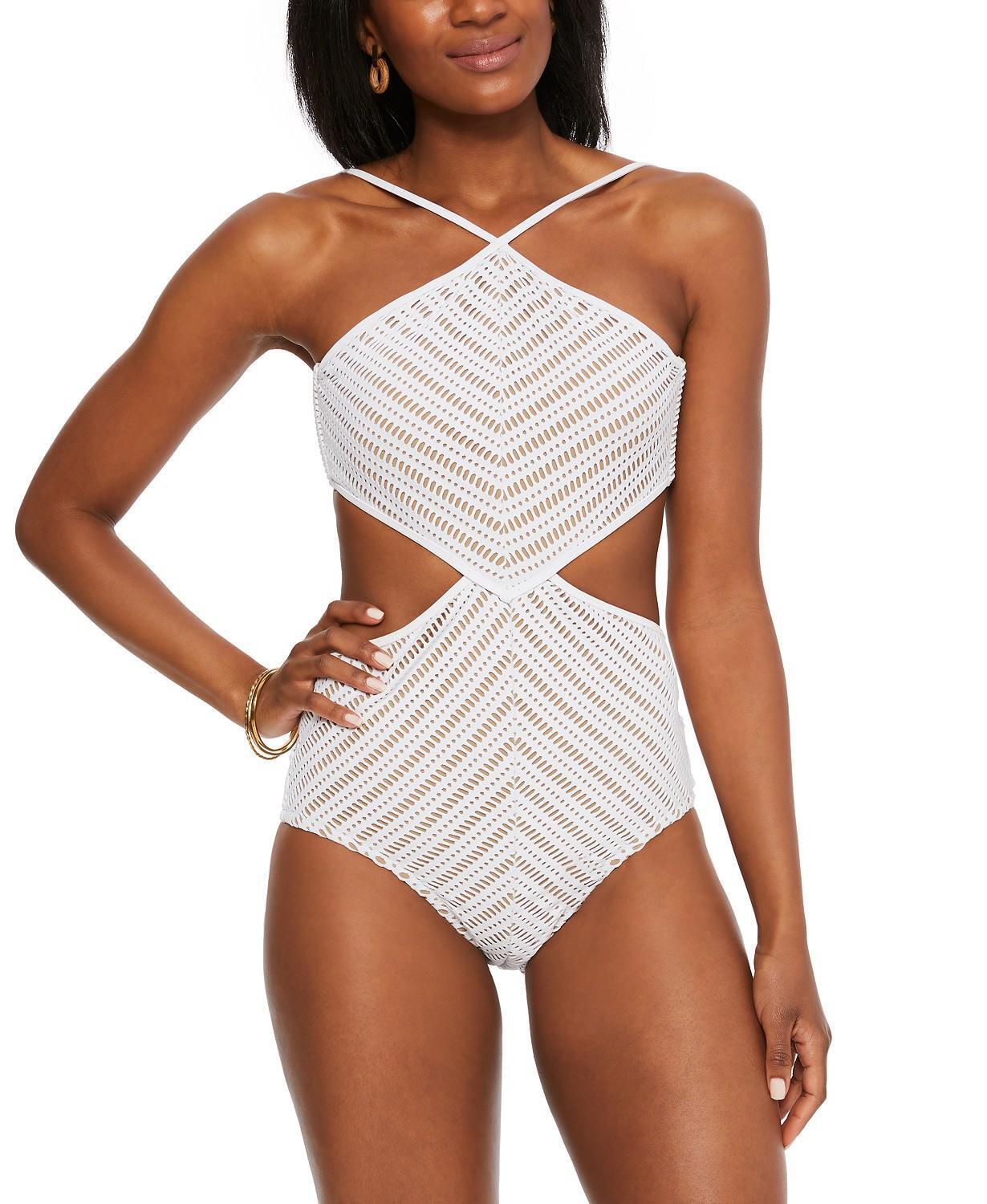 All-in-one gorgeous, this Bar Iii monokini swimsuit features a crochet texture, nude lining and chic side cutouts. Features: All-in-one gorgeous, this Bar III monokini swimsuit features a crochet texture, nude lining and chic side cutouts. Removable cups. Full coverage. Tie closure at back; adjustable shoulder straps. High neckline. Cutout details at sides. Lined. Shell: polyester/spandex; lining: polyester Imported