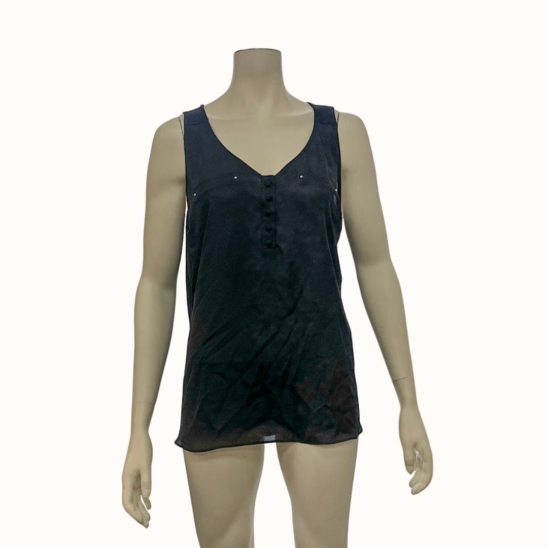 Item Notes: Hits at hips V-neck Decorative besom pockets and buttons at front Front: polyester; back: rayon/spandex Hand wash Imported