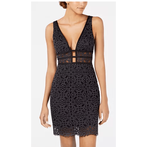 Deep V-neckline; Bodycon silhouette Hidden zipper closure at back Contrasting three-band trim at waist with illusion lace; molded cups Cotton/nylon/rayon; lining: polyester Dry clean Imported