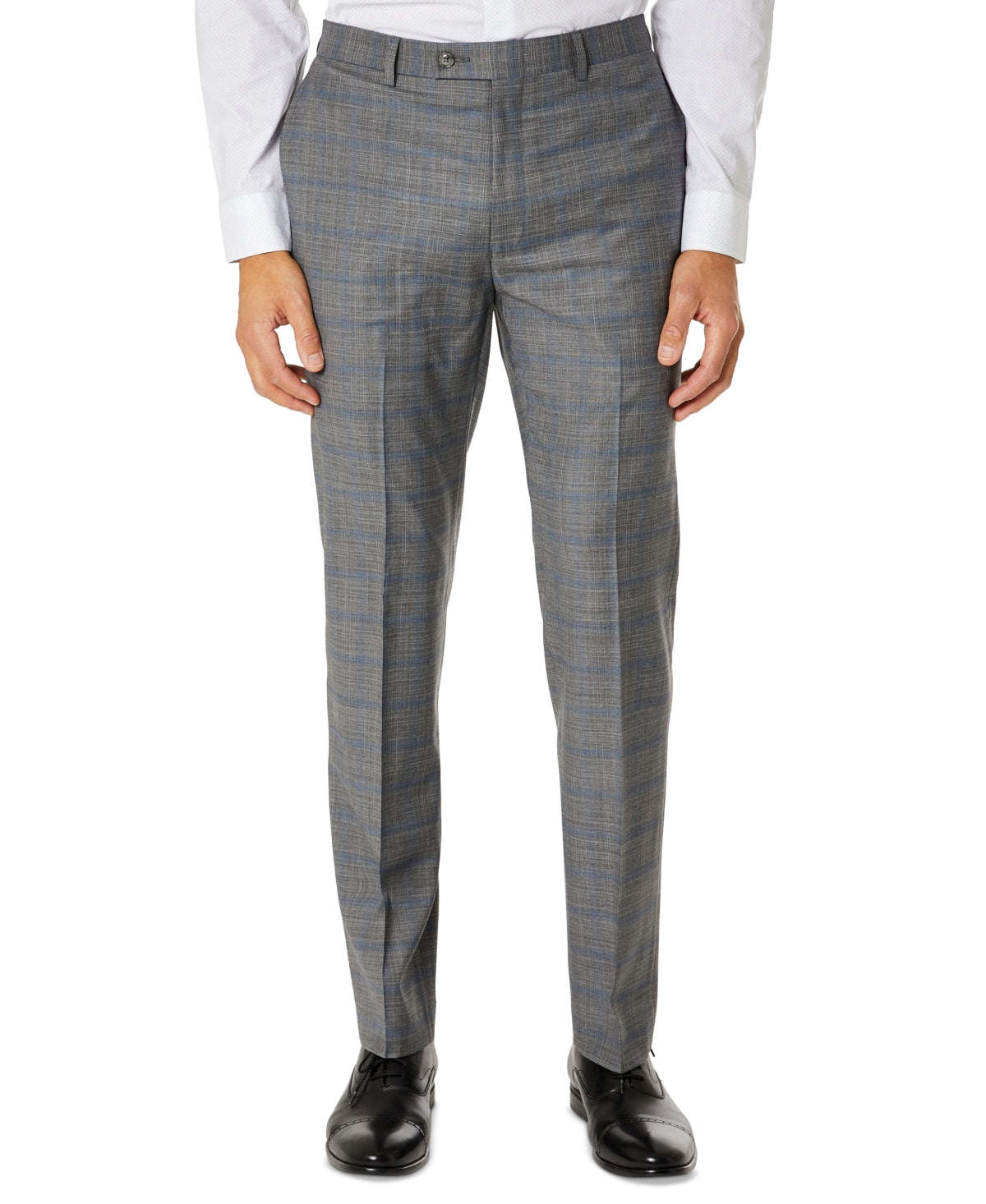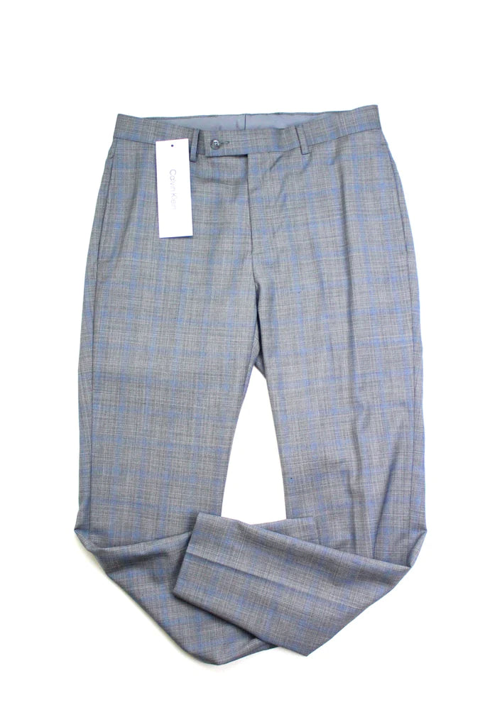 Take your professional look to the next level with these slim-fit plaid pants from Calvin Klein. Theyre part of a two-piece suit, but they can be worn separately as well. Slim fit pants sit slightly below the waist with a slim fit though hips and thighs and straight or narrow leg opening Zip fly with hook and bar closure; belt loops Two side hand pockets; two back welt pockets Creased; finished hem; fully lined Shell: wool/polyester/spandex; lining: polyester Dry clean Imported