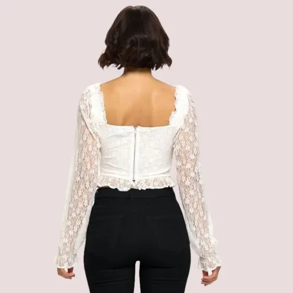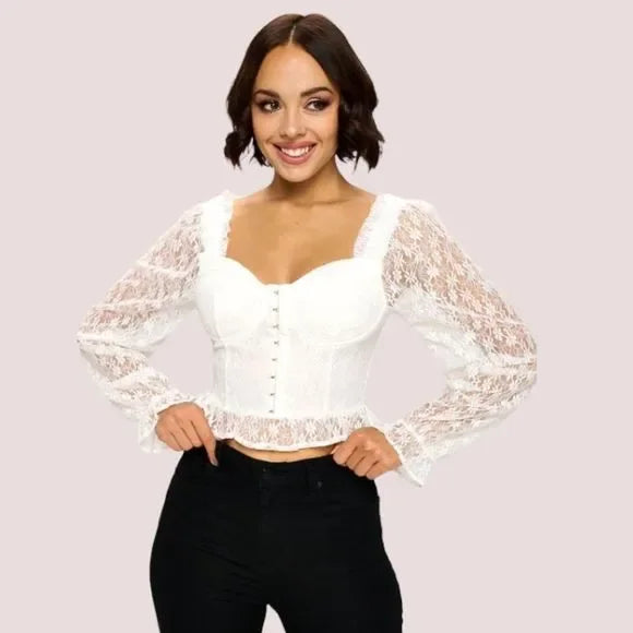 Sizing: True to size Pattern: Solid Features: Lace, corset, flounce cuffs, cropped, zip back Neckline: Sweetheart neck Size measurements: S: US 4-6; bust 34.5-35.5 in, waist 27-28 in M: US 8-10; bust 36-37.5 in, waist 29-30 in L: US 12-14; bust 38-40.5 in, waist 31.5-33.5 in Material composition: 92% nylon, 8% spandex Care: Machine wash cold. Tumble dry low.