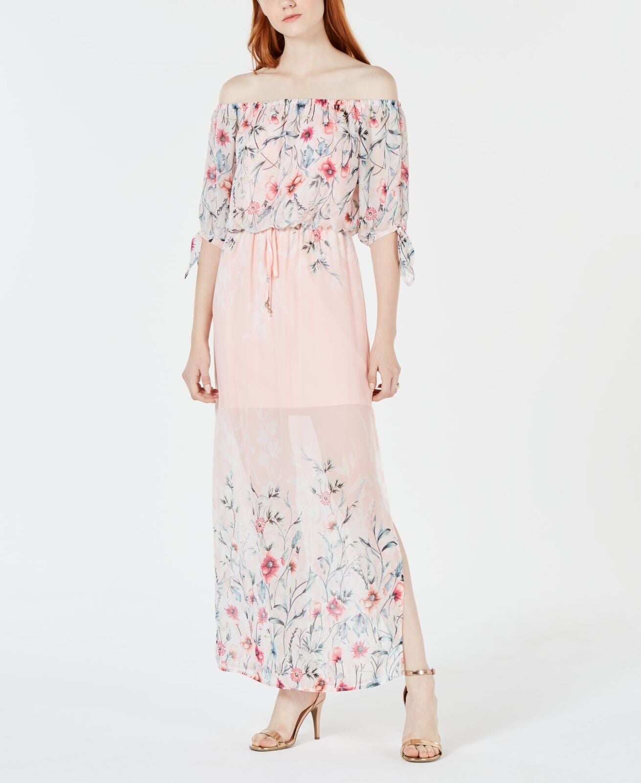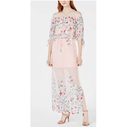 Straight neckline Pullover styling Off-the-shoulder elbow-length sleeves with tie detail Blouson bodice; self tie with gold-tone beads at waist; slit at side Shell & lining: polyester Machine washable Imported