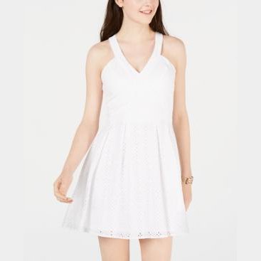 Description: Mesh insets bring pops of contemporary cool to classic eyelet with this fit-and-flare dress from Crystal Doll. Attributes: Size: 5Color: White