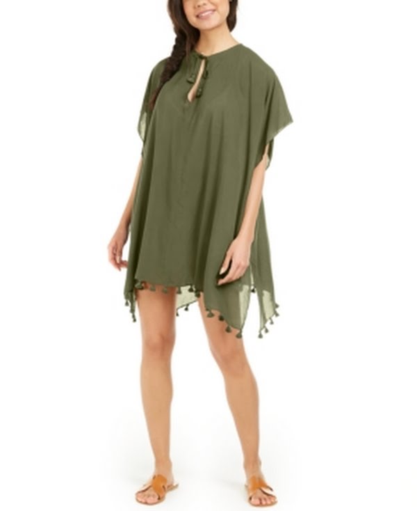 A little bit boho and a lot of fun, this flowing cover-up from DKNY finishes a chic hem with playful pom poms. Pullover styling; Crewneck with tie, keyhole Slits at sides; pom poms at hem Imported Size & Fit Relaxed fit Model is wearing a size small/6 Materials & Care Hand wash Viscose; pom poms: polyester