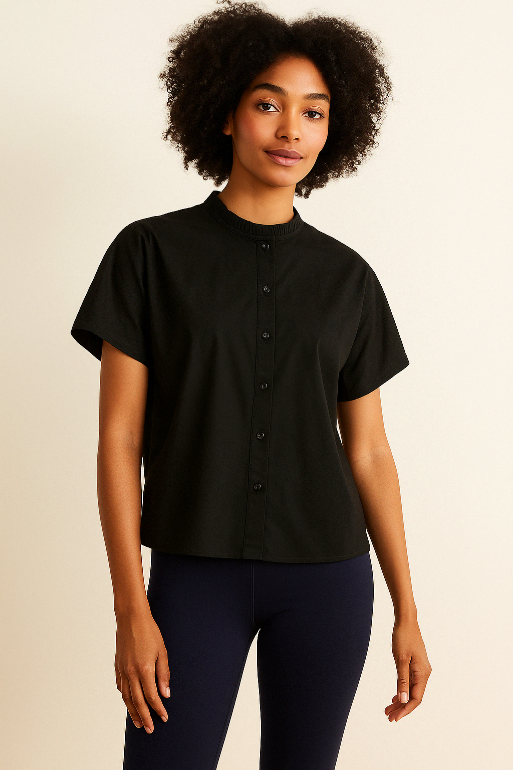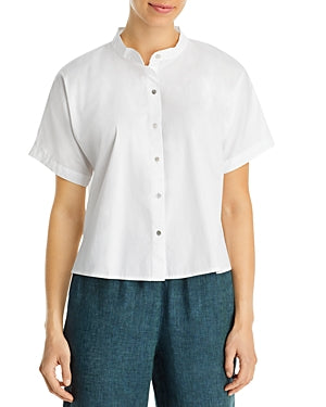 Fits large, order one size down for a slimmer fit Designed for an easy boxy fit Hits at waist Model measurements: 510 height, 33.5 bust, 23.5 waist, 34.5 hips, wearing a size extra small PRODUCT DETAILS ABOUT THE BRAND Eileen Fisher began her fashion career with a few understated silhouettes inspired by Japans ubiquitous kimono. With stores across the US, Canada and the UK, the brands ready-to-wear collection consists of womens wardrobe staples that are easy to style and layer. Fisher designs with comfort in mind, and her straightforward pieces reflect this effortless confidence. Key fashion items range from soft sweaters and lightweight jackets to wide-leg pants and oversized shirt dresses. Eileen Fisher is strongly committed to improving clothing manufacturing processes. The brand works with sustainable fabrics, designs upcycled garments, and remakes unsold clothes from past seasons into new products like pillows and wall hangings. Accessory offerings include shoes and handbags, each one channeling Fishers signature simplicity and ease. FEATURES Mandarin collar Short sleeves Front button closures EILEEN FISHER designs ethical, timeless, well-made clothes that are part of a responsible lifecycle. It is the largest womens fashion company to be a certified B Corporation, voluntarily meeting high standards for social and environmental performance, accountability, and transparency. This item is part of our 100% Bloomingdales collection, featuring exclusive pieces you wont find anywhere else. Imported MATERIAL & CARE 96% organic cotton/4% elastane Machine wash