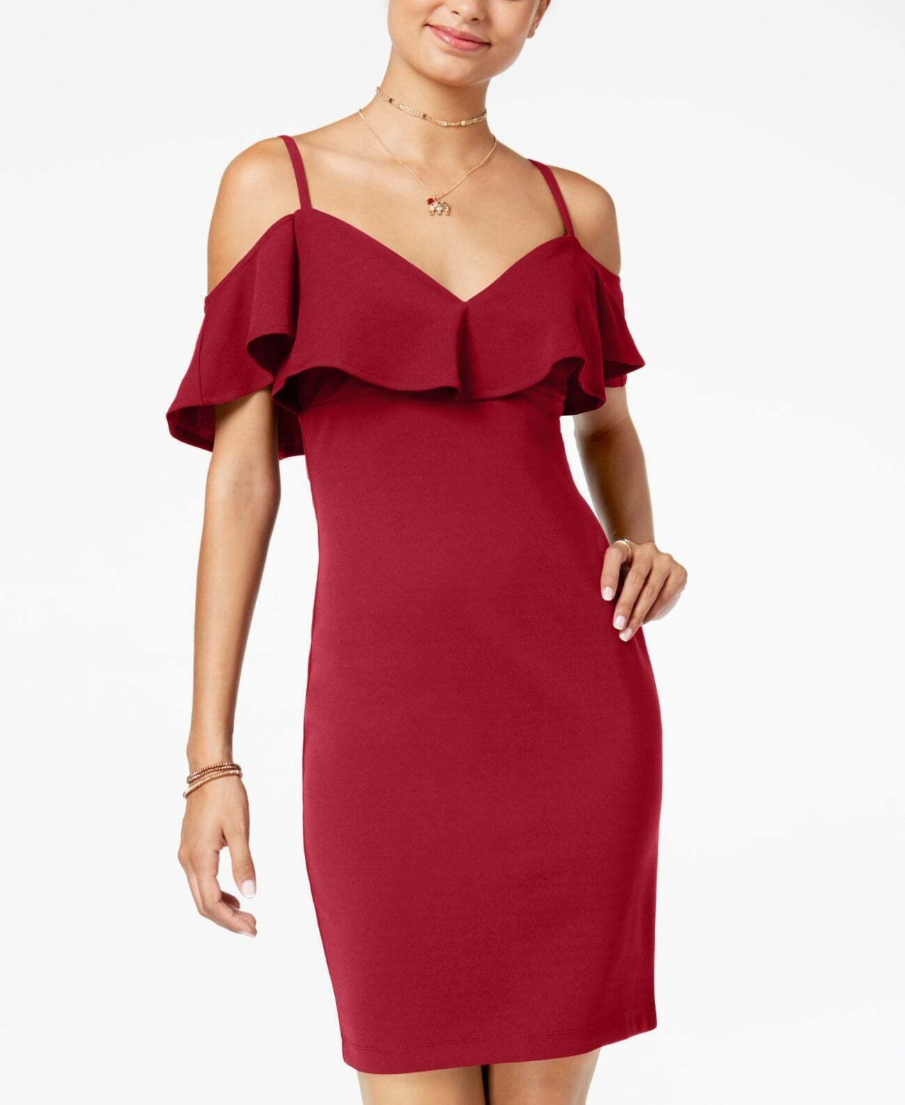 Emerald Sundaes fierce bodycon dress features a ruffled popover that gives the cold-shoulder cutouts a flirty finish. Approx. model height is 510 and she is wearing size medium Approx. 27 long from center back to hem. Length is based on size medium and varies 1/2 between sizes. Pullover styling V-neckline; bodycon silhouette Cold-shoulder cutouts; thin shoulder straps with short off-the-shoulder sleeves; flutter layer at top Unlined IMPORTANT NOTE: This item arrives with a return tag attached and instructions for removal. Once the tag is removed from the dress, this item cannot be returned. Polyester/spandex Hand wash