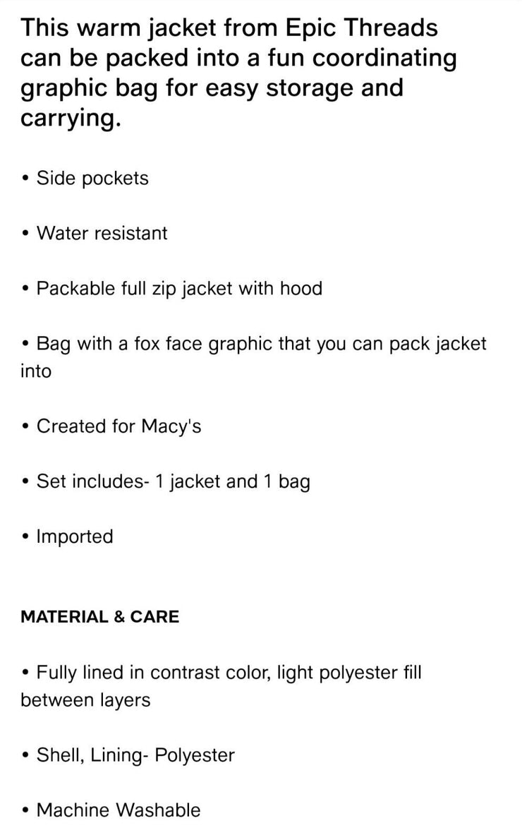 Epic Threads Little Girls Water-resistant Packable Pals Jacket Kids Kids Clothing - Coats & Jackets. A packable hooded jacket with a matching bag by Epic Threads gives a lightweight warmth and comfort. Set includes- a hooded jacket and a matching bag Long sleeve Polyester Machine washable Imported