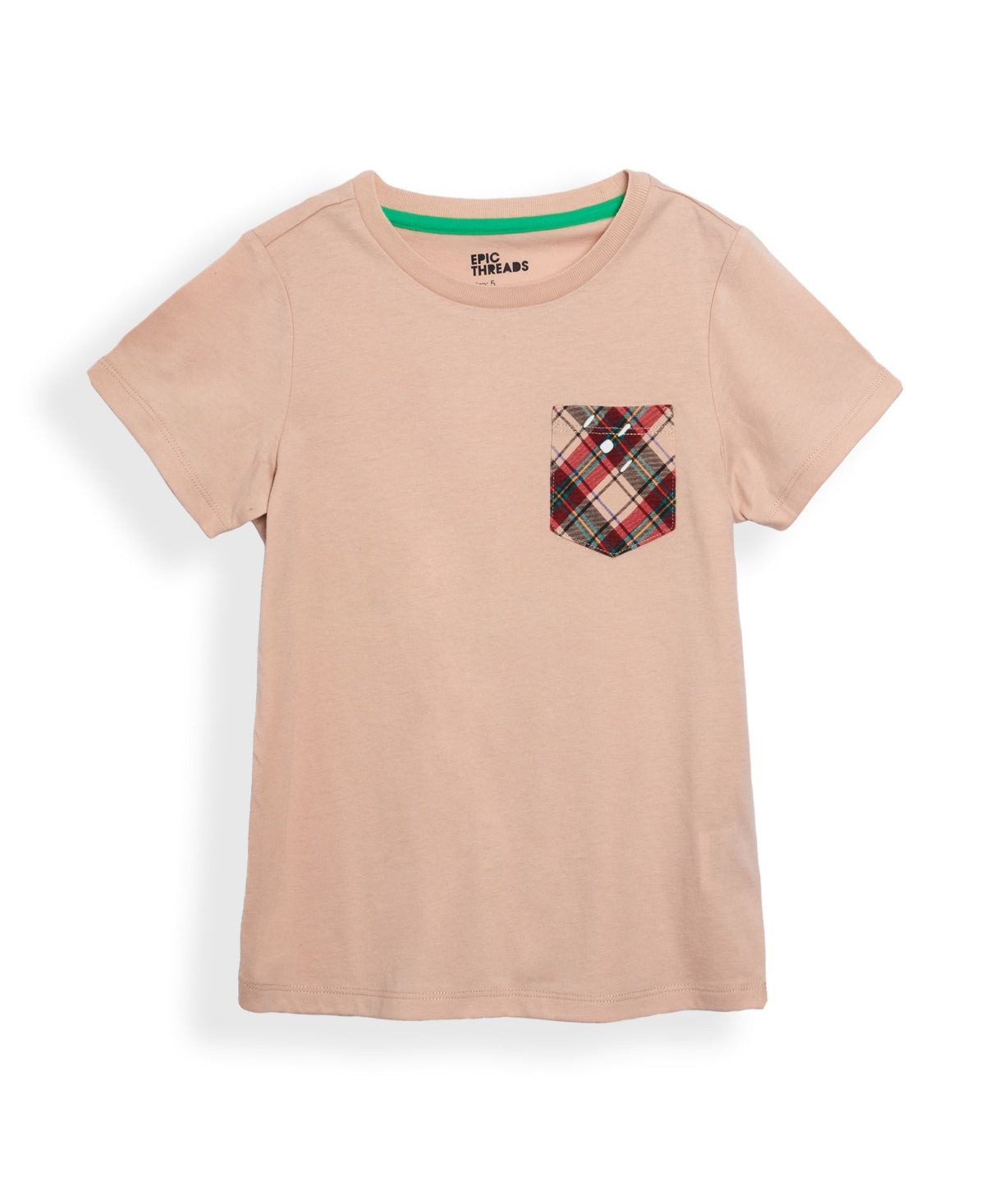 A festive plaid pocket brings an updated feel to this comfy T-shirt from Epic Threads. Ribbed crewneck Short sleeves Printed pocket at left chest Cotton, Polyester Machine Washable Imported