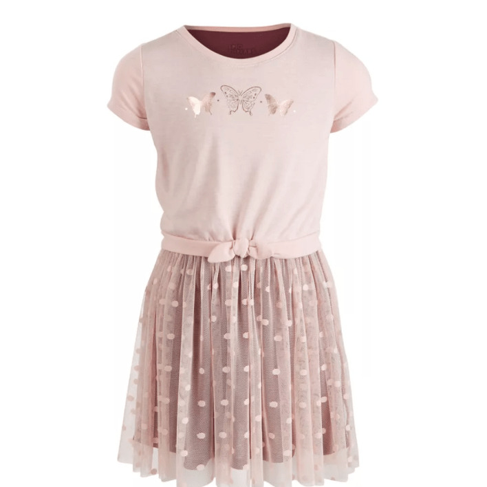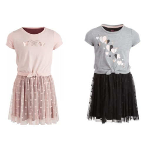 Your little girl will twirl her way into everyones heart in this adorable glitter-graphic dress from Epic Threads. Scoop neckline; Fit and flare silhouette Self tie and graphic print with glitter detail at front; tulle dot skirt overlay Polyester/rayon; skirt and lining: polyester Machine washable Imported