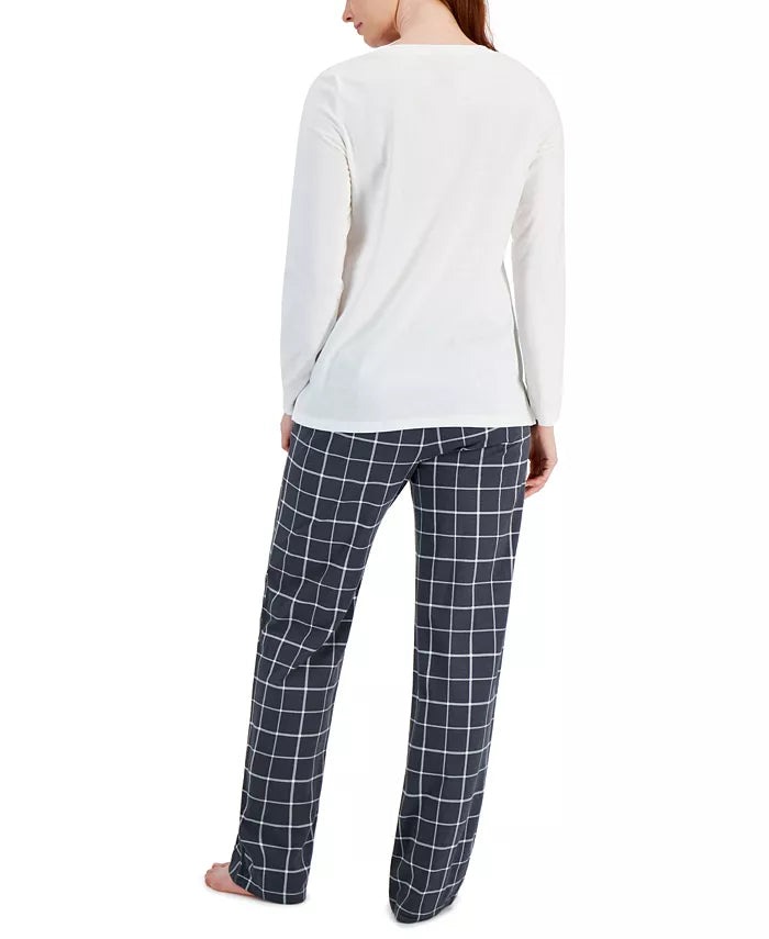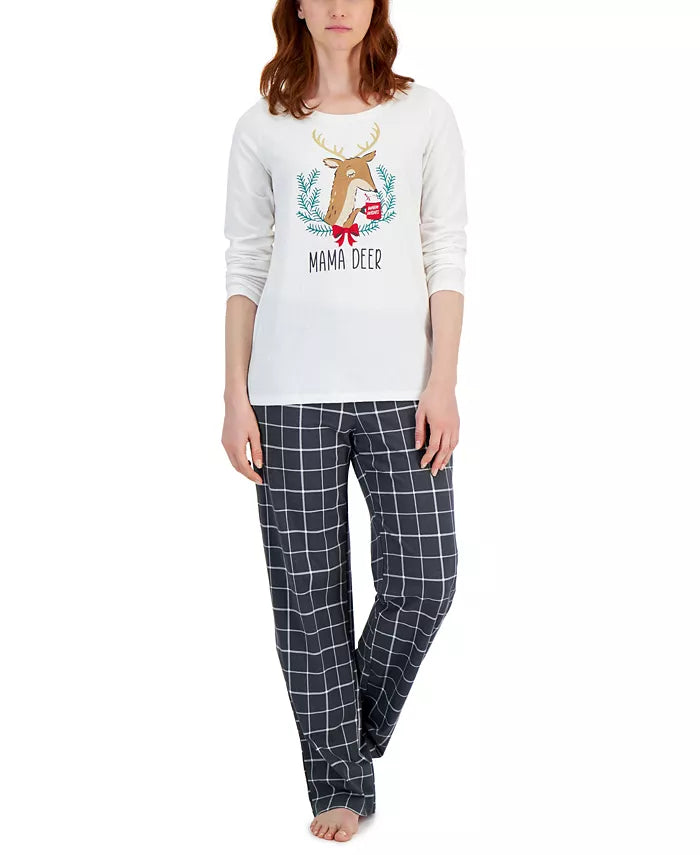 Oh, deer! This comfy jersey set from Family Pajamas features a graphic top and plaid pants for a fun look. Top: hits at hip, jersey fabric, graphic at front, scoop neckline, pullover styling, long sleeves Pants: hits at ankle: approx. inseam: 30, jersey fabric, elastic waist Search Family Pajamas Deer to see matching styles for the whole family Top: 100% cotton; pants: cotton/polyester Machine washable Imported