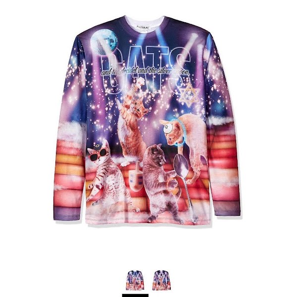 100% Polyester Imported Machine Wash Cats and Dreidel holiday tee Photorealistic design so real it will make you look twice Long sleeve tee shirt with tattoo sleeves 100 percent polyester machine washable Imported