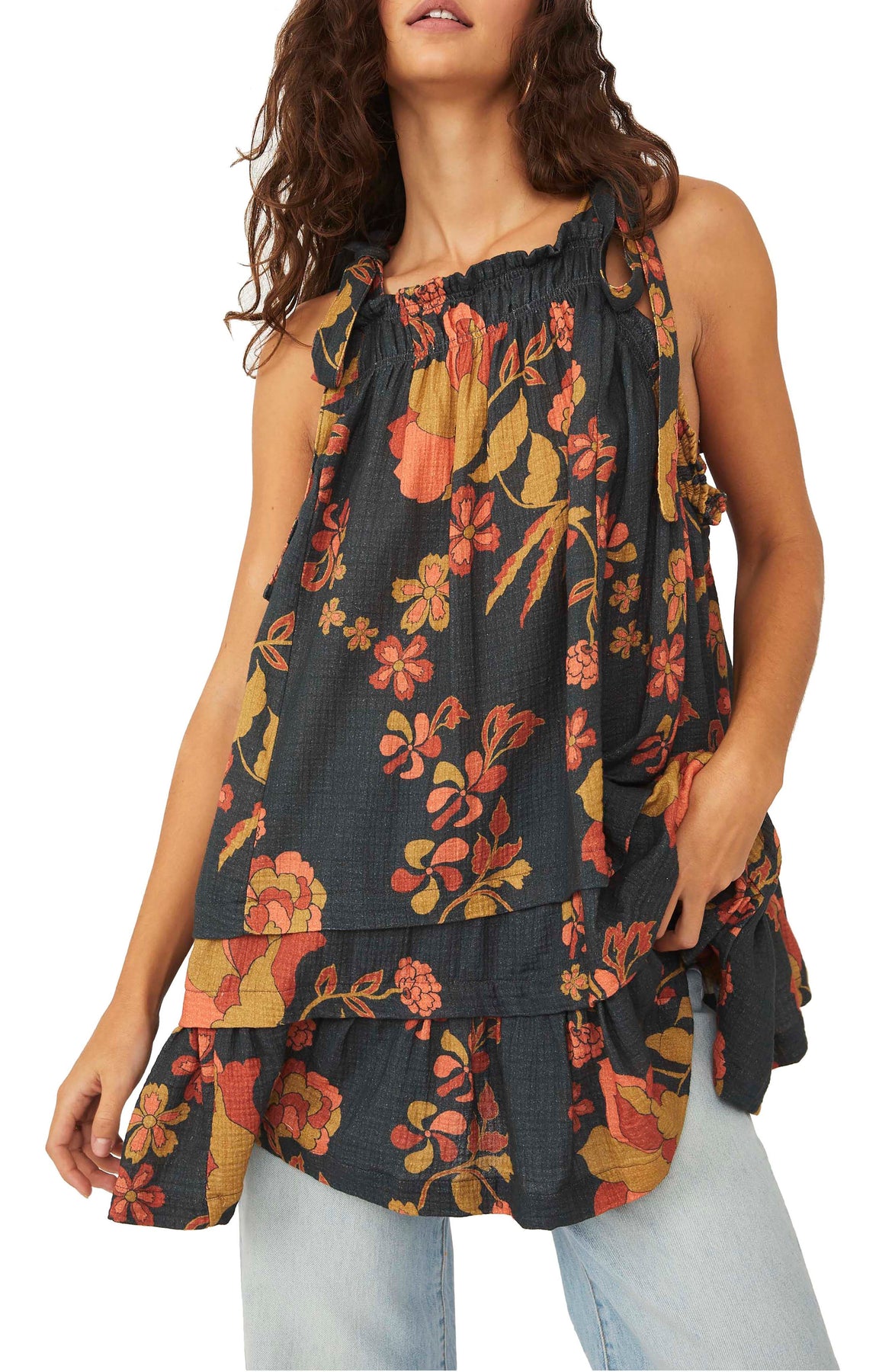 Retro flowers fall around a billowy cotton tunic styled with a tiered, ruffled hem and adjustable tie straps at the shoulders. 30 center front length (size Large) High neck Adjustable tie straps 100% cotton Dry clean or machine wash, line dry Imported Womens Clothing.