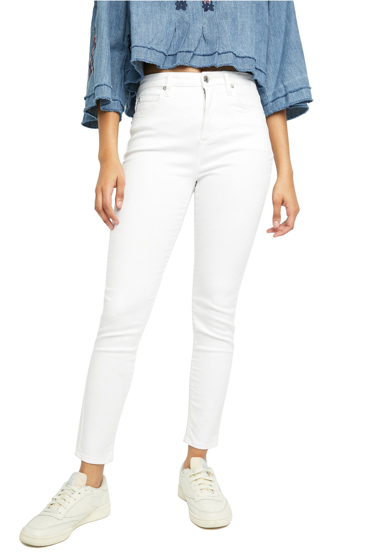 Free People Montana Skinny in White. Size 24, 25, 26, 27, 28, 30, 31. 79% cotton 13% lyocell 6% poly 2% elastane. Made in Turkey. Machine wash. Zip fly with button closure. 5-pocket styling. 12 at the knee narrows to 8 at the leg opening. FREE-WJ199. OB1133451. Free People invokes a spirit of femininity and creativity. Throughout their line of sweaters, tees, dresses and more, each piece incorporates a high level of quality and originality that reflects their adventurous it girl. With all thats constricting in the world today, Free People says your clothes dont have to be. Be yourself, be creative, be free.