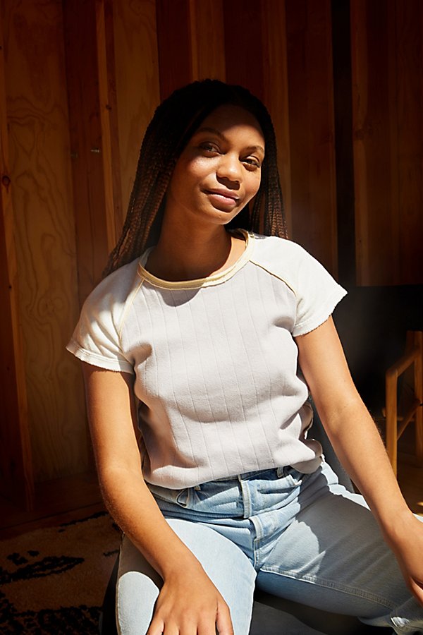 Textural, vertical stripes add interest to this classic T-shirt. Raw-edge creweneck Short raglan sleeves Raw-edge cuffs Ribbed Curved raw-edge hem Recycled cotton/cotton Hand wash Imported SIZE & FIT About 24 from shoulder to hem Model shown is 510 (177cm) wearing US size Small. Womens - W Trend Separates > Saks Off 5th > Barneys Warehouse. Free People. Color: Found Moon. Size: S.