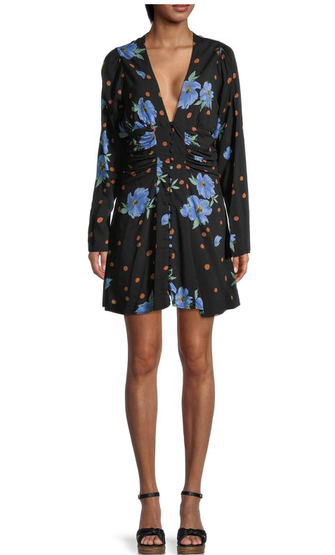 Item Notes: Ruched from front to sides, this flared mini dress with button detail accentuates the waist. V-neck Long sleeves Pullover style Covered front buttons Front-to-side ruching Lined Viscose Hand wash Imported SIZE & FIT...