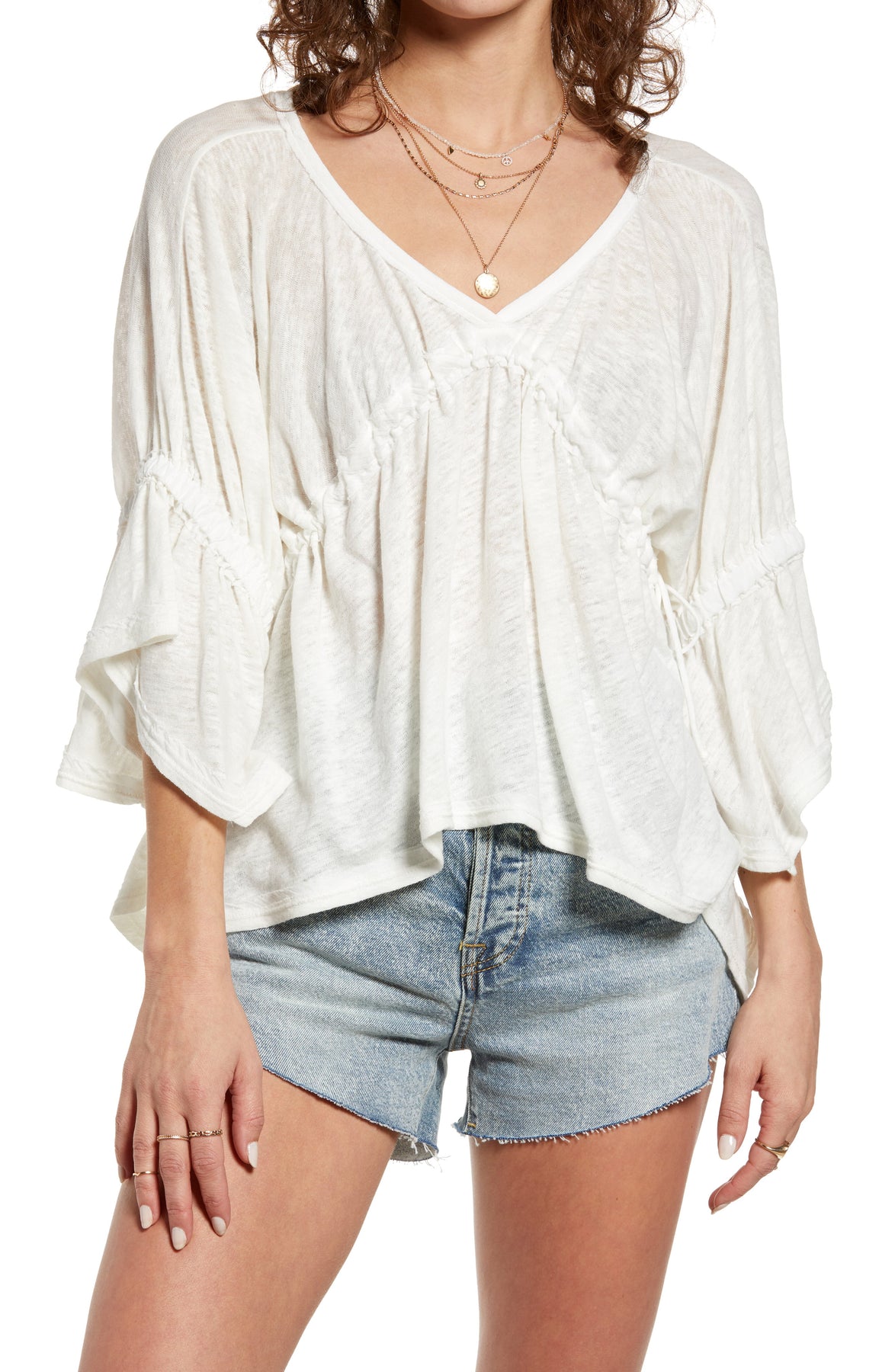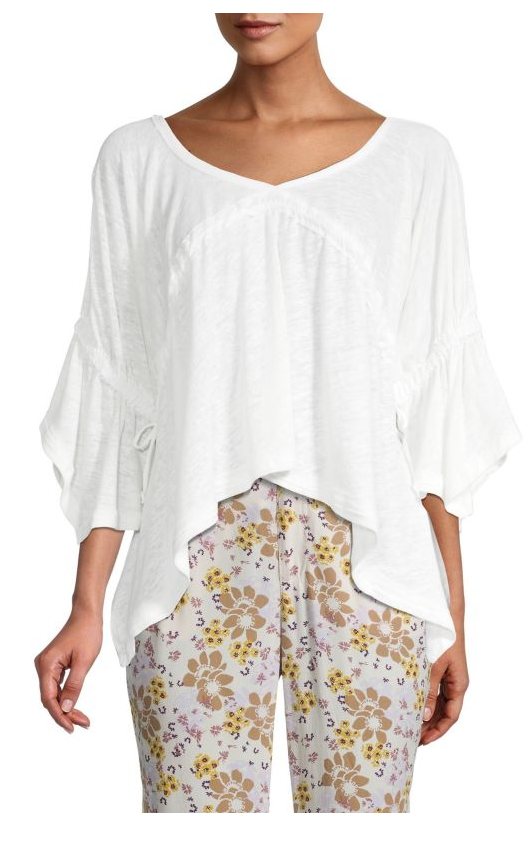 Ruched drawstring detail tames the relaxed flowy silhouette of this top and elevates its style. V-neck Three-quarter sleeves Pullover style Drawstrings detail Handkerchief hem Linen/cotton Hand wash Imported SIZE & FIT About 21 from shoulder to hem Model shown is 510 (177cm) wearing US size Small. Women Rtw Swim Outerwear - W Trend Collections > Saks Off 5th > Barneys Warehouse. Free People. Color: Ethereal. Size: S.