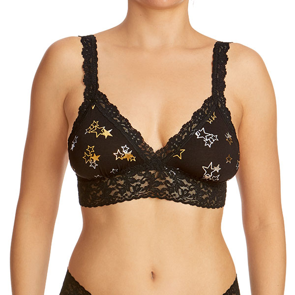 Offers light support for most A-C cup sizes. Band sizing: XS=32, S=34, M=36, L=38. Details & care Ladylike with a touch of celestial magic, this crossover triangle bralette shines with metallic stars and is edged by soft stretch lace. Slips on over head Soft cup Adjustable straps 95% rayon, 5% spandex Hand wash, line dry Made in the USA of imported fabric Womens Clothing