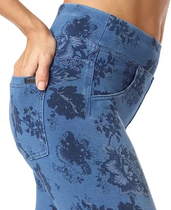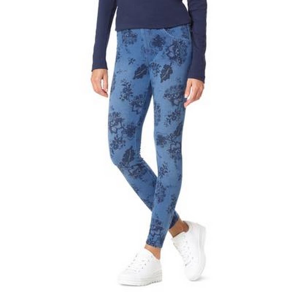 A chic floral print stands out on these comfy denim-look leggings by HUE®. Length: Approx. inseam: 28 Texture: Denim-look fabric Special Features: No side seams Waistband: High-rise elastic waistband with faux fly Pockets: Faux front pockets; functional back pockets Cotton/polyester/spandex Machine washable Imported