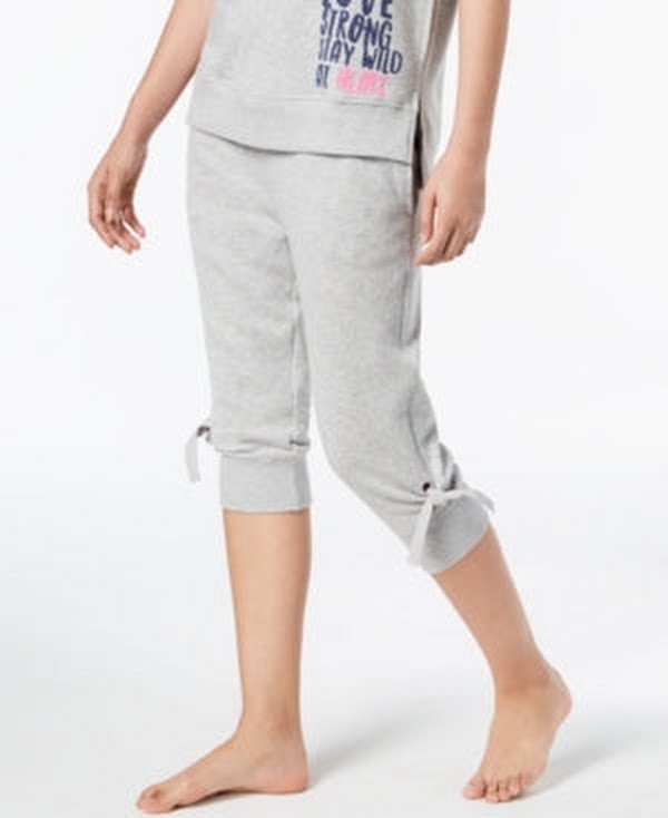 Cozy and soft in sweatshirt-inspired french terry, HUE®s cropped jogger pajama pants are finished with cute tie details at the hems. Pull-on styling Pockets at side hips Tie detail at side hems; ribbed cuffs Hits below knee Cotton/polyester Machine washable Imported