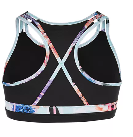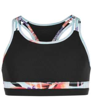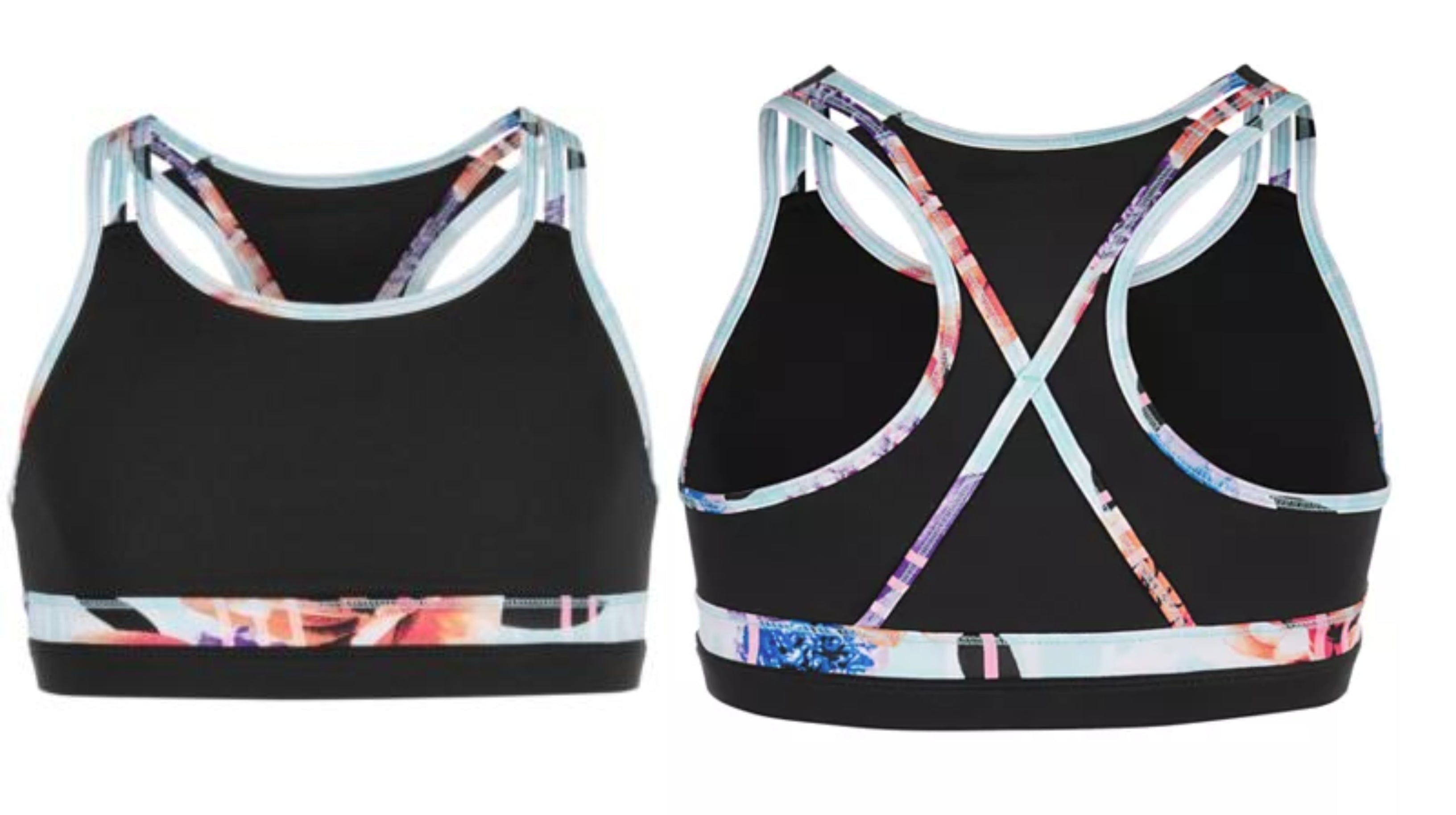 Vibrant printed trim brightens her sporty look with this racerback sports bra from Ideology. Round neckline Printed trim at neckline, band and cross back Lined Polyester/spandex; lining: polyester Machine washable Imported