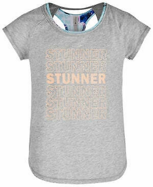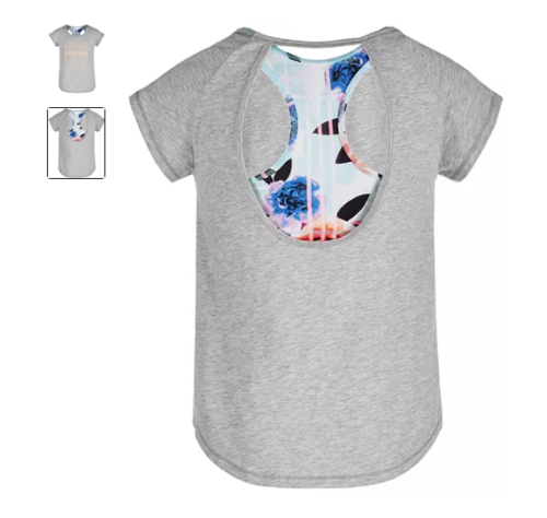 Ideology offers a comfy and fun look for active days with this layered-look T-shirt with a charming graphic print. Round neckline Graphic print at front Layered-look design with printed racerback sports bra and cutout back Cotton/polyester Machine washable Imported