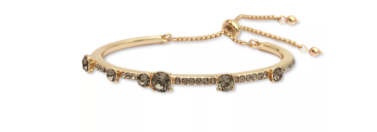 Black and gold make a luxe combination on these emboldened bracelet from Inc International Concepts. Black and gold make a luxe combination on these emboldened bracelet from INC International Concepts®. Set in gold-tone mixed metal; glass Approx. diameter: 2-1/4 Slider closure Photo may have been enlarged and/or enhanced.