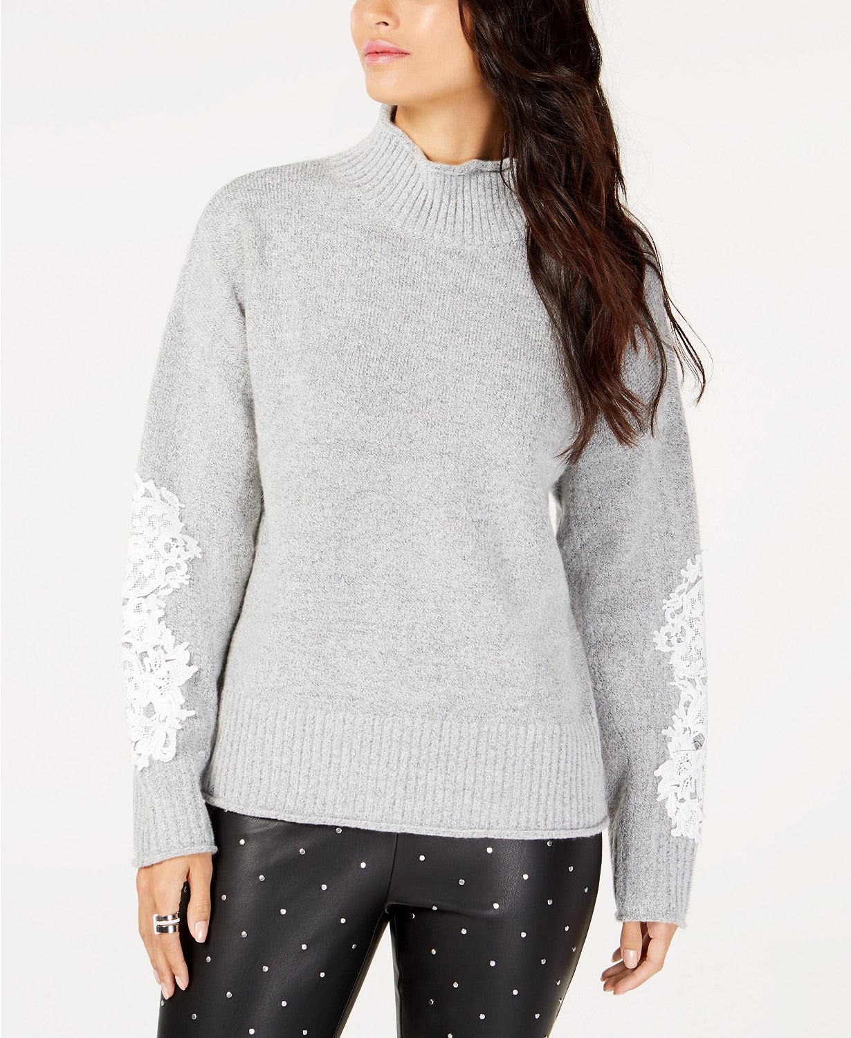 I.N.C. International Concepts adds a sophisticated finish to this mock-neck sweater with lace appliqué at the lower sleeves. Approx. model measurements: height: 510; bust: 31-1/2; waist: 24; hips: 35 Hits at hip Mock neckline Placed lace at lower sleeves The Statement Sweater featured on The Gift List Acrylic/polyester/spandex; exclusive of decoration Machine washable Imported