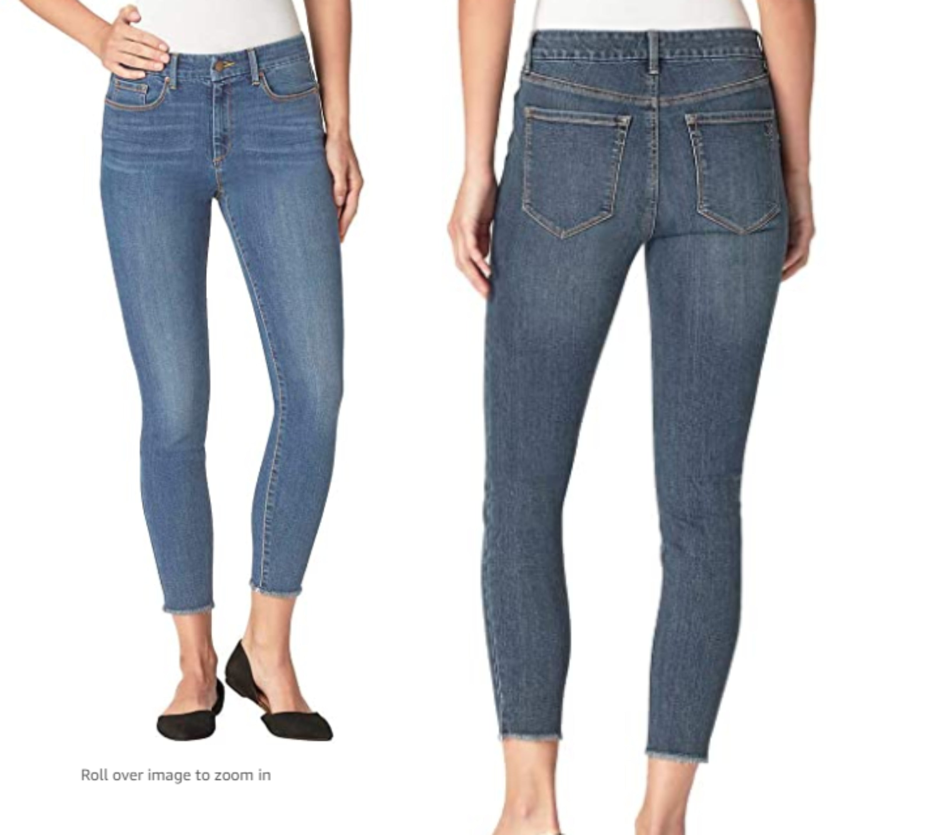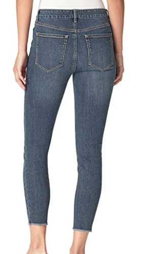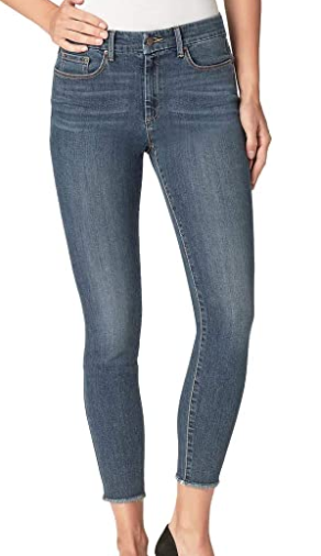 Zipper closure Jessica Simpson Colors: Blue (Night Denim), Black, Gray (Ontario) 5 Pocket high rise skinny jean. Super stretch fabric. Front YKK zipper and button closure. Belt loops. Flattering silhouette Easy Fit. Size Conversion: 2=26, 4=27, 6=28, 10=30, 12=31, 14=32. Inseam (in): 30. Front Rise (in): 10 Gray: 54% Cotton?23% Viscose?22% Polyester?1% Elastane Blue: 56% Cotton?25% Viscose?18% Polyester?1% Elastane Machine wash cold with like colors.Only non-chlorine bleach when needed. Tumble dry low, remove promptly