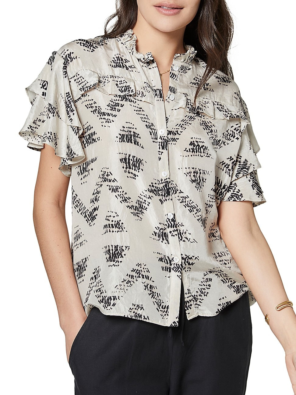 About the brand: Effortlessly feminine fashion. Sidera B Silk Top in bleached stone with crinkled design, ruffle collar, and tiered flutter sleeves Approximately 25in from shoulder to hem 100% silk Hand wash Imported. Crewneck Short sleeves, ruffled detail Front button closures Ruffled detail at front Allover print MATERIAL & CARE Main: 100% silk Dry clean