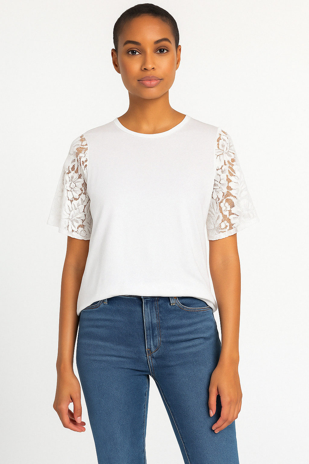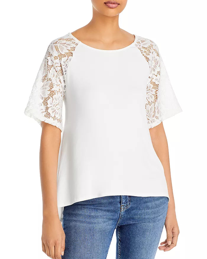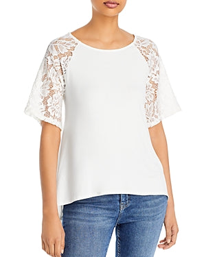 Kim & Cami Swing Lace Short Sleeve Tee. Rounded neckline Back keyhole button closure Short lace bell raglan sleeves Lace back yoke High low hem Made in USA MATERIAL & CARE 95% rayon/5% spandex; lace: 90% nylon/10% spandex Machine wash
