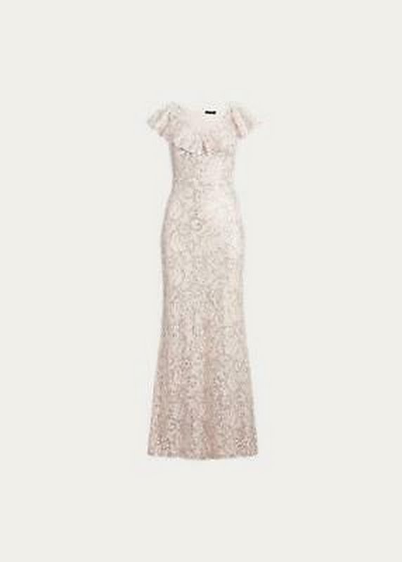 Designed with cascading ruffle trim that frames its asymmetrical neckline this gown is crafted from a stunning sequined lace fabric for luxe appeal.