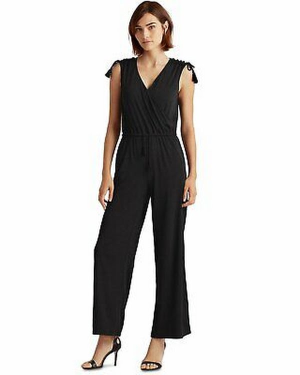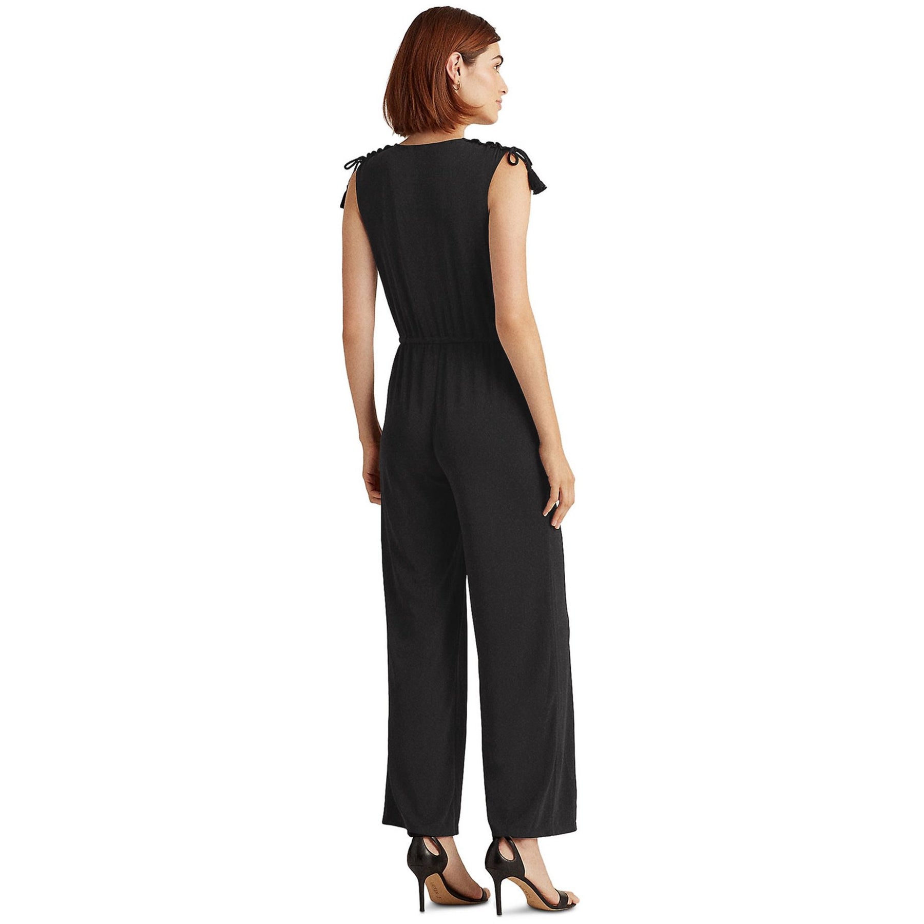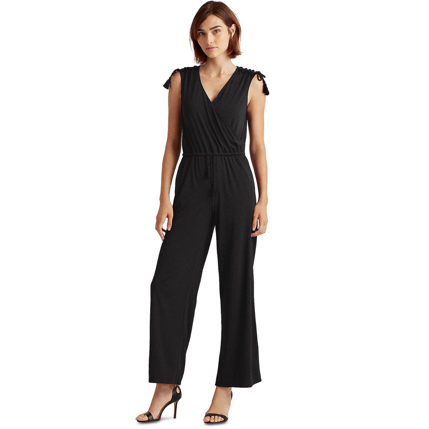 Lauren Ralph Laurens sleeveless jumpsuit effortless ease of movement. Defined by a faux-wrap bodice and delicate ruching, it is designed with playful tassels at the waist and the shoulders. V-neck. Wrap-style bodice. Gathered ruching with self-ties at the shoulders. Elasticized waist. Front angled pockets. Shirring into the waistband. Self-tie tassel at the waist 100% Authentic - New with tags Color: Black Style: Faux-wrap bodice Fabric Composition: 94% Polyester, 4% Elastane; trim: Cotton/Polyester Machine wash Origin: Philippines
