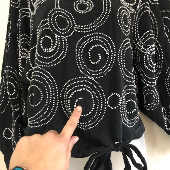 Lillie Rubin beaded silk top Missing a few beads on the front, please see picture Tie on the front hip Wide sleeves Black with white beads