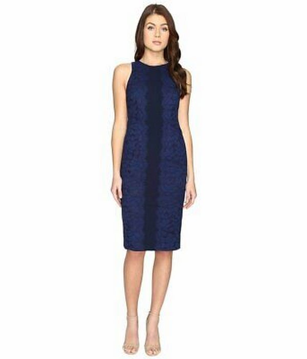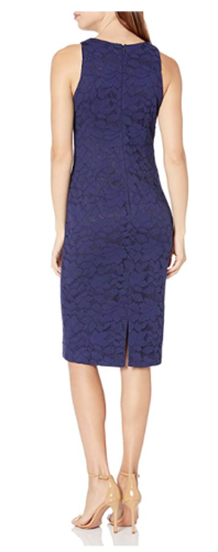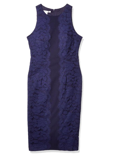 Youll be sure to impress in this stunning lace dress. ; Gorgeous sheath dress features beautiful lace design. ; Round neckline. ; Sleeveless design. ; Solid trim down center front. ; Defined waistline. ; Concealed zipper at back. ; Lined. ; Straight hemline. ; 35% nylon, 35% viscose, 30% cotton; Combination: 97% polyester, 3% spandex; Lining: 100% polyester. ; Dry clean only. ; Imported. Measurements: ; Length: 43 in ; Product measurements were taken using size 2. Please note that measurements may vary by size.