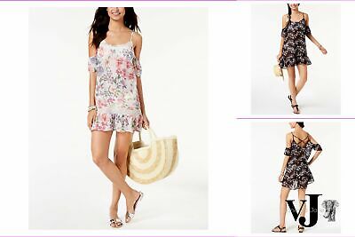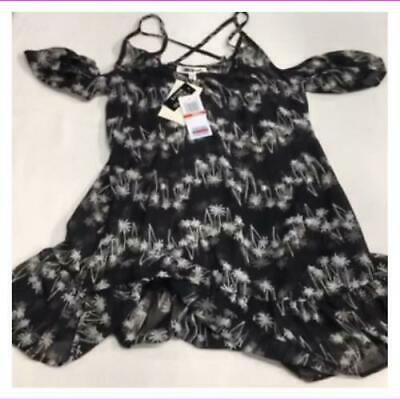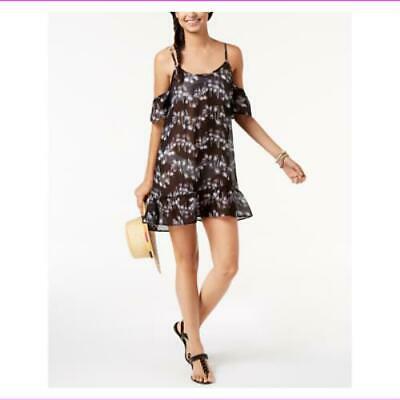 Item Notes: Update your swim look with this sheer cover-up from Miken, a softly printed dress with cold-shoulder cutouts and a strappy back. Pullover styling; Knee length; Scoop neckline Short sleeves with cold-shoulder cutouts; straps cross at back; Tassels at hem Black