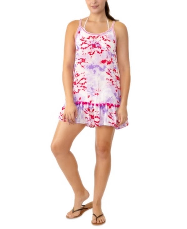 Miken PURPLE TIE-DYE Juniors Printed Tiered Pom-Pom Cover-Up US X-Small Features: Miken opens up this printed cover-up with contrasting trim at the neckline and closes it out in style with pom-pom accents at the ruffled hem. Ruffled hem with pom-pom accents; trimmed with contrasting thread. Pull-on styling; scoop neckline; adjustable shoulder straps. Hits at thigh. Style #: I7121C641 Polyester Imported.