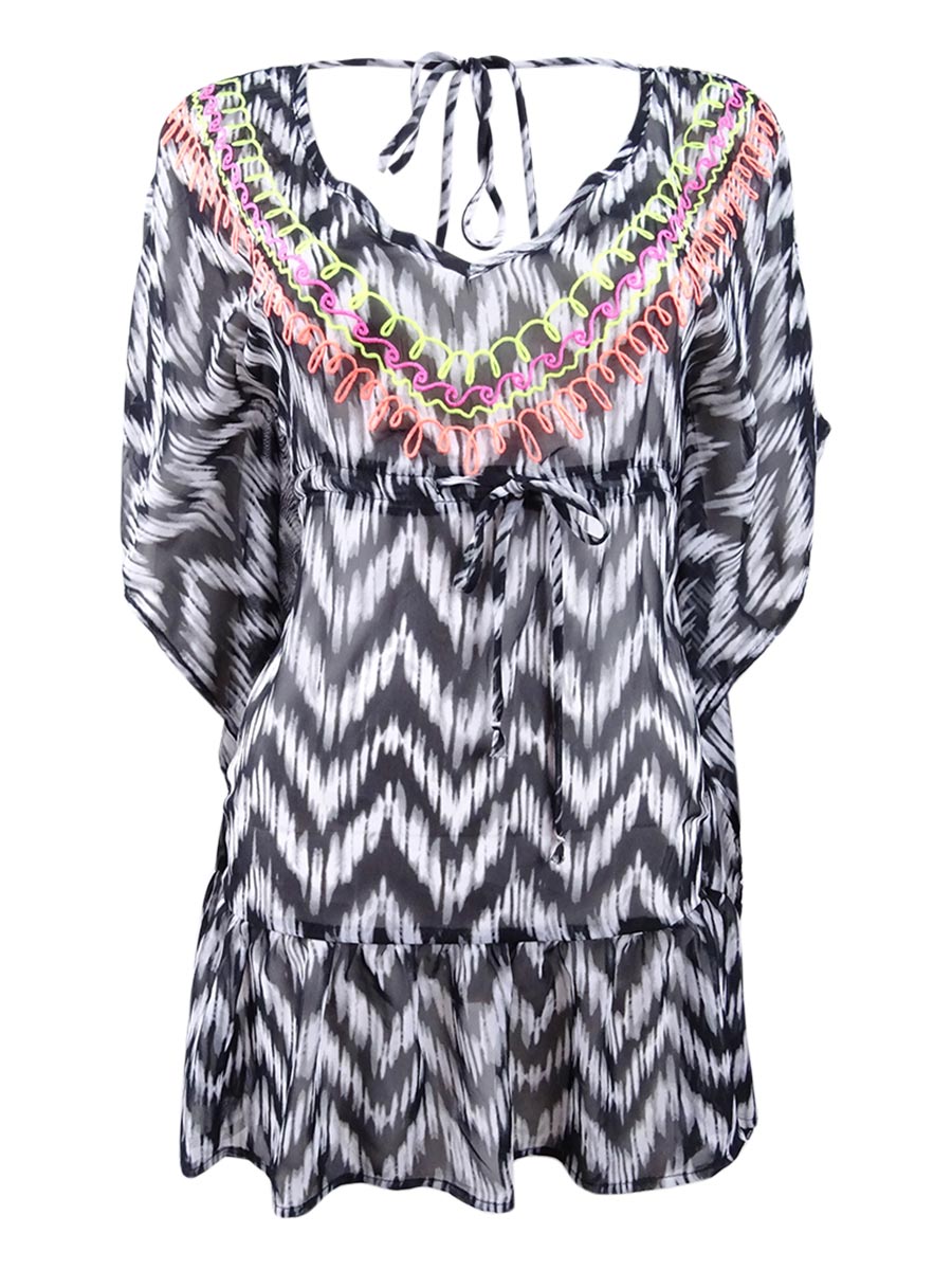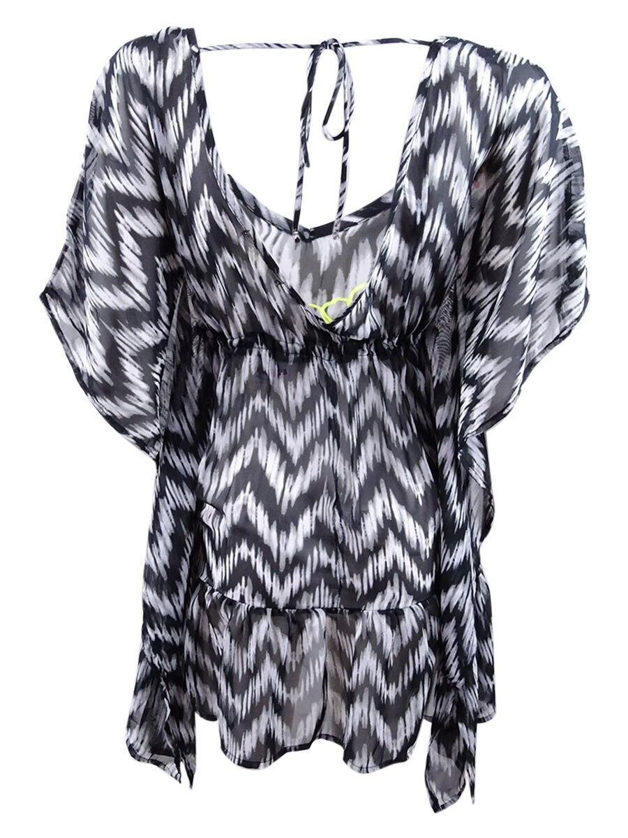 100% Polyester Unlined Pullover styling V-neckline, Short flutter sleeves V-back with strappy tie; elastic at waist Above knee length, Ruffled hem Country of Origin: China Retail Price: $28.00.Due to variances in monitor color, and lighting, the color of some items may differ slightly from the photographs