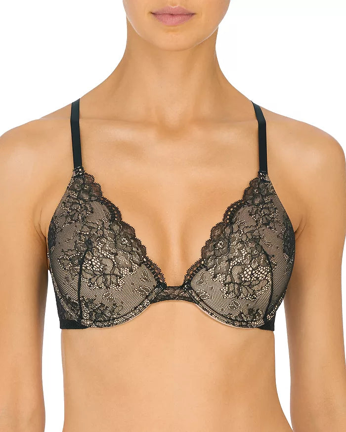 Underwire foam cups, stretch-lace overlay Plunge neck Adjustable straps Lace band Back hook closure Style #731209 Find your right bra size Imported MATERIAL & CARE Lace: 83% nylon/17% spandex; back lining: 78% nylon/22% LYCRA® spandex; Cup lining: 100% polyester Hand wash