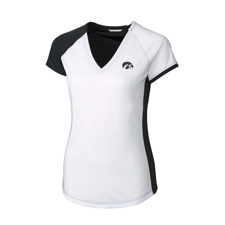 NCAA Iowa Hawkeyes Womens Short Sleeve Presley V-Neck Tee, Small, Black Description 100% Polyester Imported Color contrast detailing at V neck, color blocking, short sleeve Tee 100% Interlock jersey polyester, cb drytec, moisture wicking Garment decorated with school logo in the USA Athletic tailored fit Machine wash cold, Normal/only Non-chlorine bleach when needed/Tumble dry low, Normal/low iron as needed