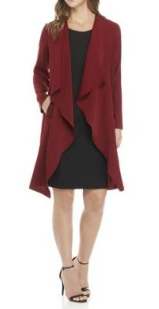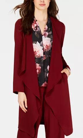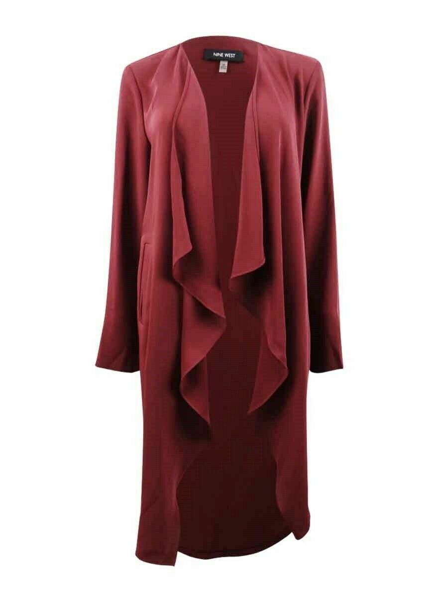 Draping open at the front for an effortless feel, this topper jacket from Nine West works perfectly in both career and casual looks. Approx. model measurements: height: 510; bust: 31-1/2; waist: 24; hips: 35 Hits above knee; approx. 38-1/2 long Note: this item tends to run large; we suggest ordering one size down for the perfect fit Draped open front; no closure Collarless; welt pockets at front Crepe texture; tiered detail at back Unlined Polyester Dry clean Imported