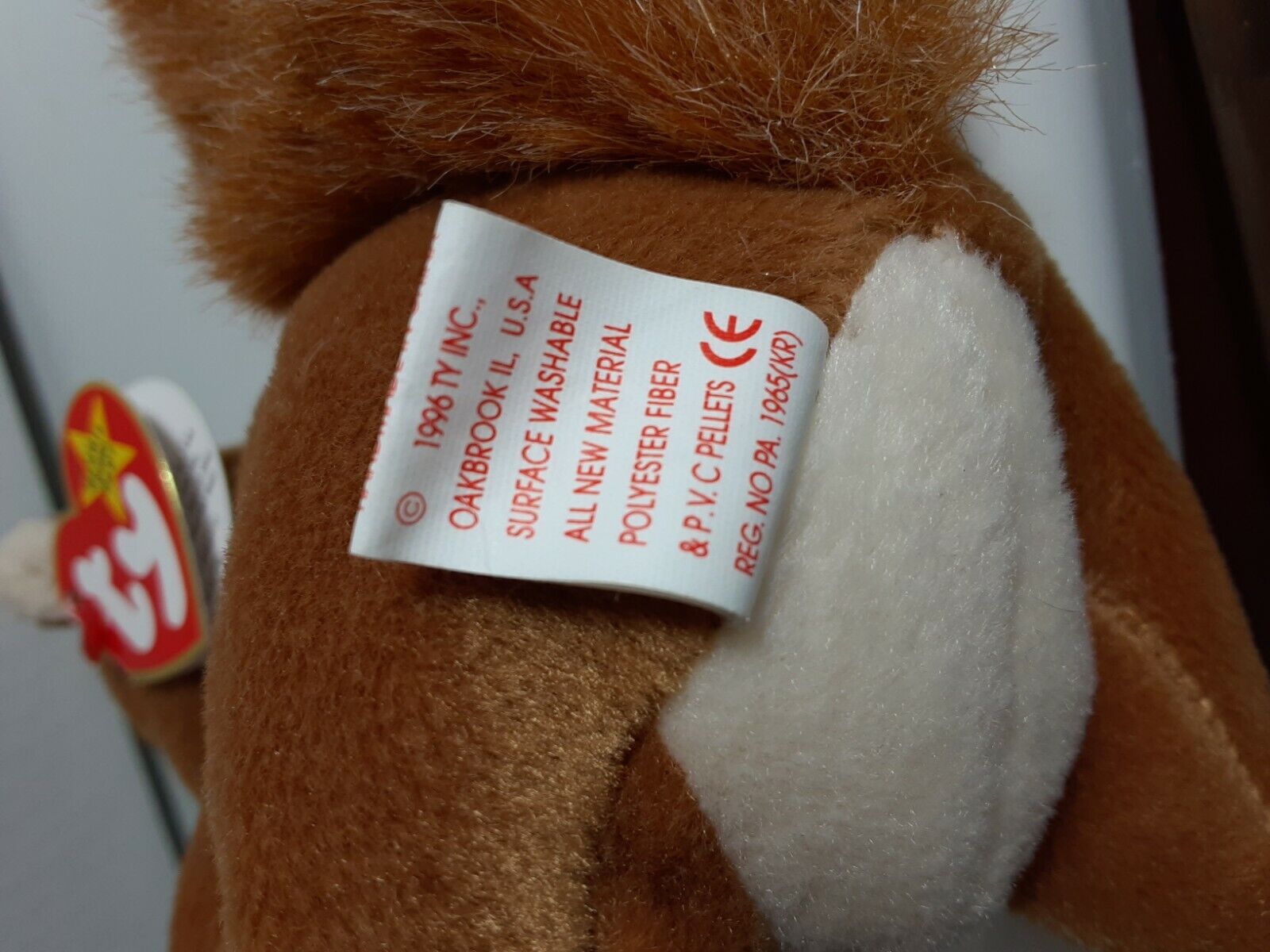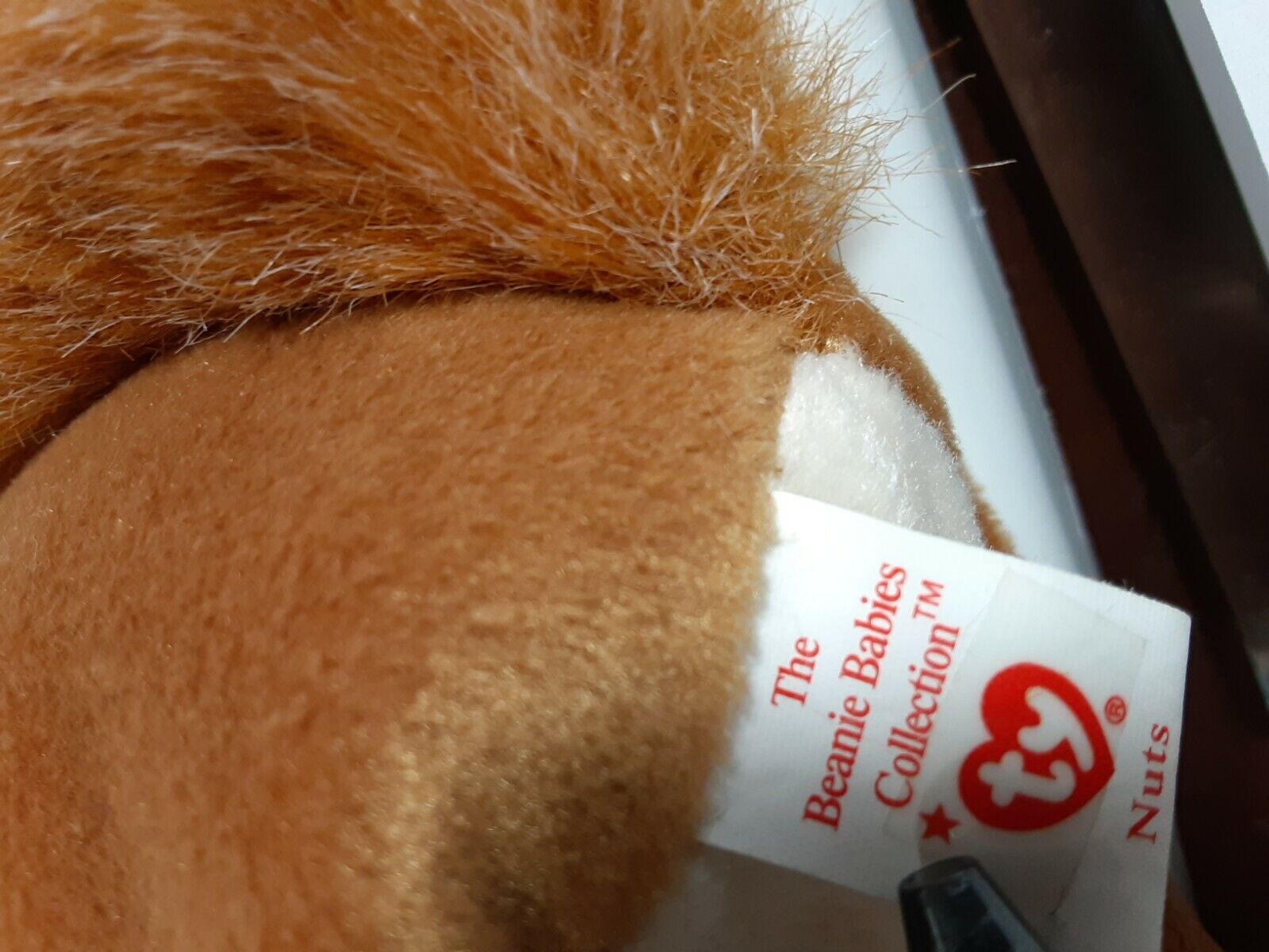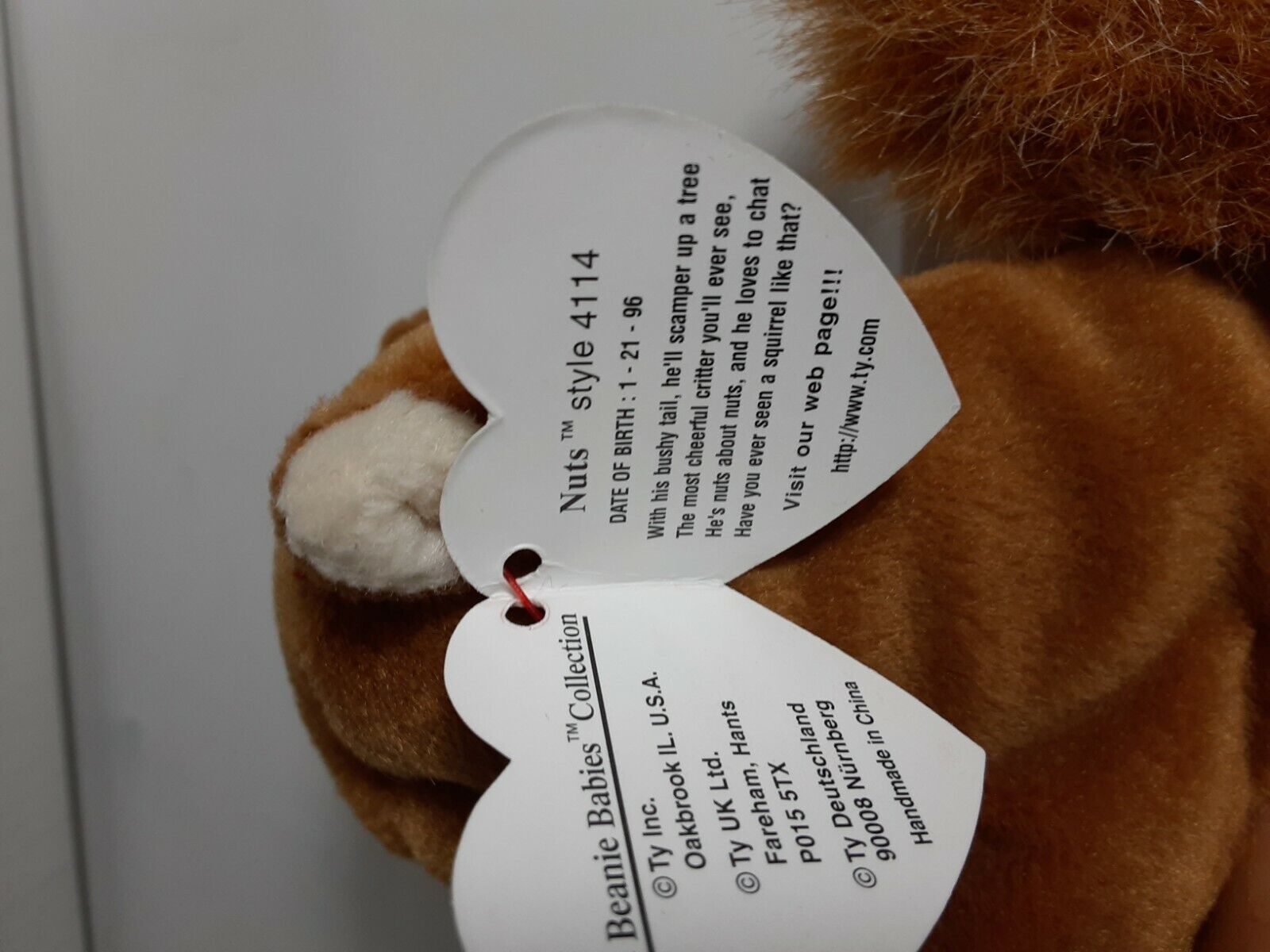 Nuts the Squirrel Beanie Baby ERRORS 9+ VERY RARE Retired 4114 TY 1996. Errors: 1. Style # is next to Nuts name 2. Date of birth is not spelled out. It is numerical. 3. Visit our webpage!!! Should not be on tag. 4. Website should read www.ty.com not http://www.ty.com 6. Oakbrook should have a comma after on hang tag. 7. No period after A on U.S.A tush tag 8.No period after C on P.V.C tush tag 8. Extra space after birth on swing tag. 9. No TM near R (registered Mark) on swing tag